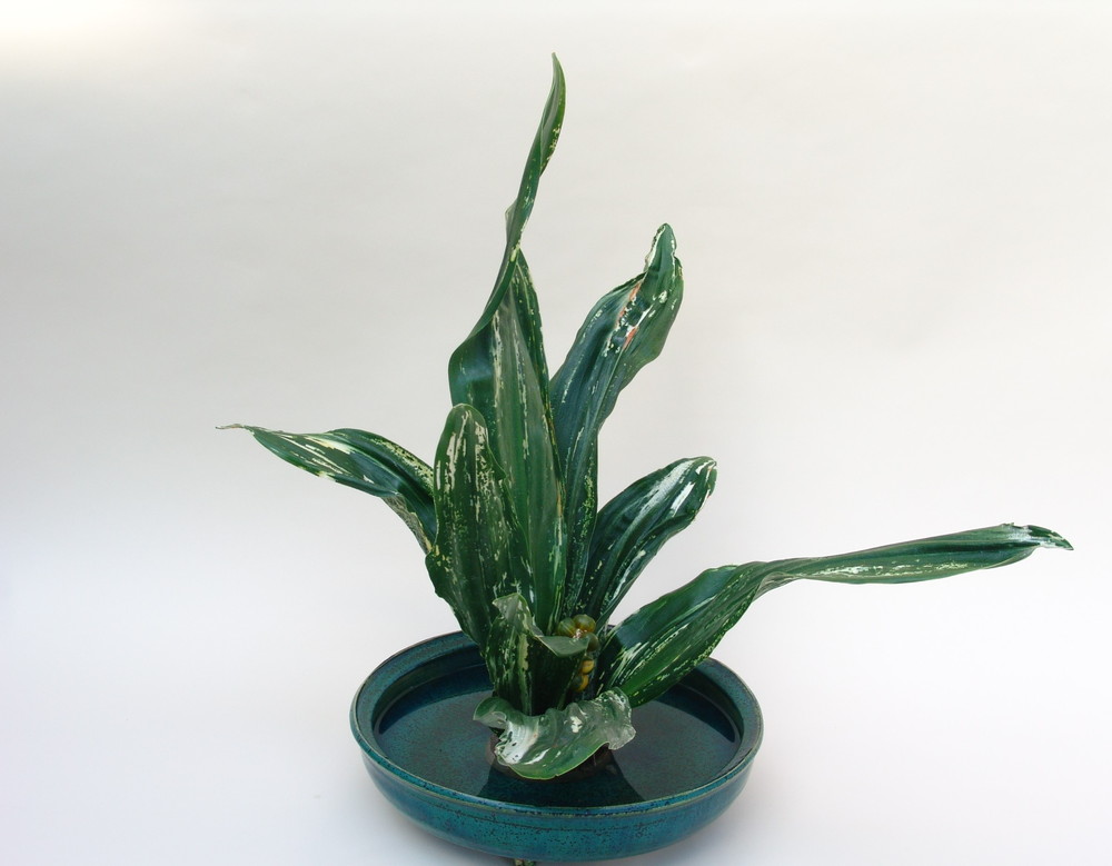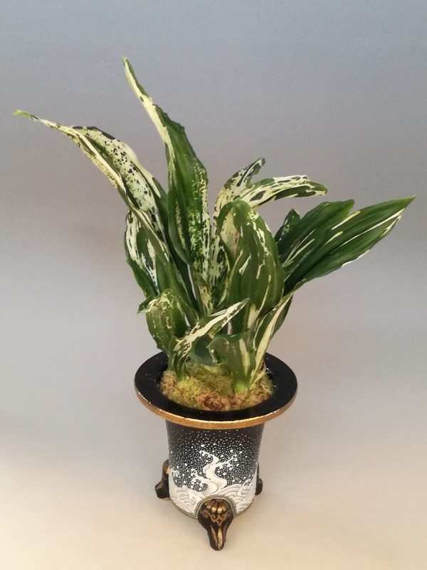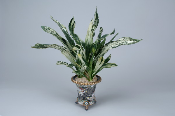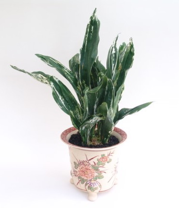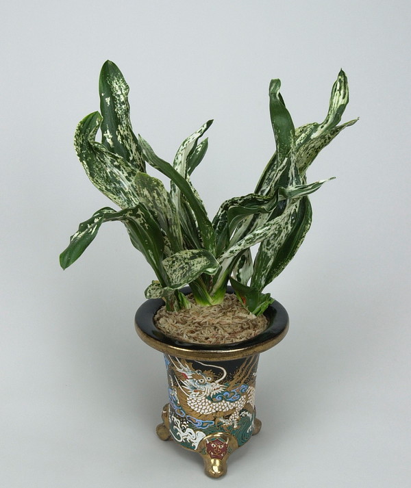 残雪(ざんせつ) 江戸時代から生け花でも使われている「大象観」とよばれる原木に図が現れたもので、濃紺緑色の葉全体に変化に富んだ図を現し、豪快な姿を見せる。江戸末期に発見された品種ながら、現在も高い人気を誇る。性質は強健で作りやすい。歴史が古いだけに、図質にも大きな差があり、おもとの中でも最も価格差のある品種。