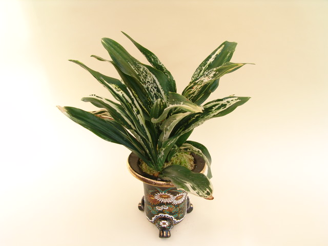 葉長30㎝・葉幅6㎝内外の大葉系の中型種。古くから愛されてきた、大衆向きの品種だったが、近年特に図性の良い系統が現れ、高値で取引され業界を騒がせたことは記憶に新しい、現在は図性の良いものが取引される。濃緑色の中立ち葉に雪白の図はコントラストが鮮やかで万人の目を引き付ける。性質は強健で採光は朝日を充分採り、その後はやや弱めにする。施肥は多め、繁殖はとても良い。また実付きも良く、露地植えでも良く育ちます。