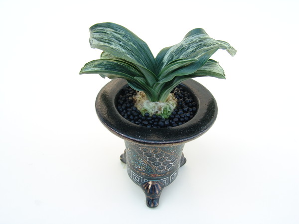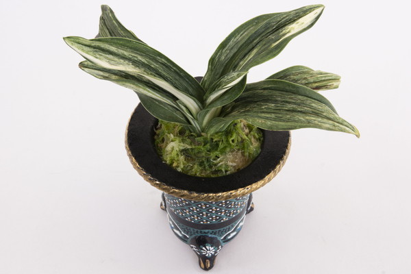 千代田の、太陽型の万年青です。紺覆輪深く、千代田斑も冴え、雅糸竜が昇ります。姿が分かり易い。葉繰りも良く、性質は強健で作りやすい品種。