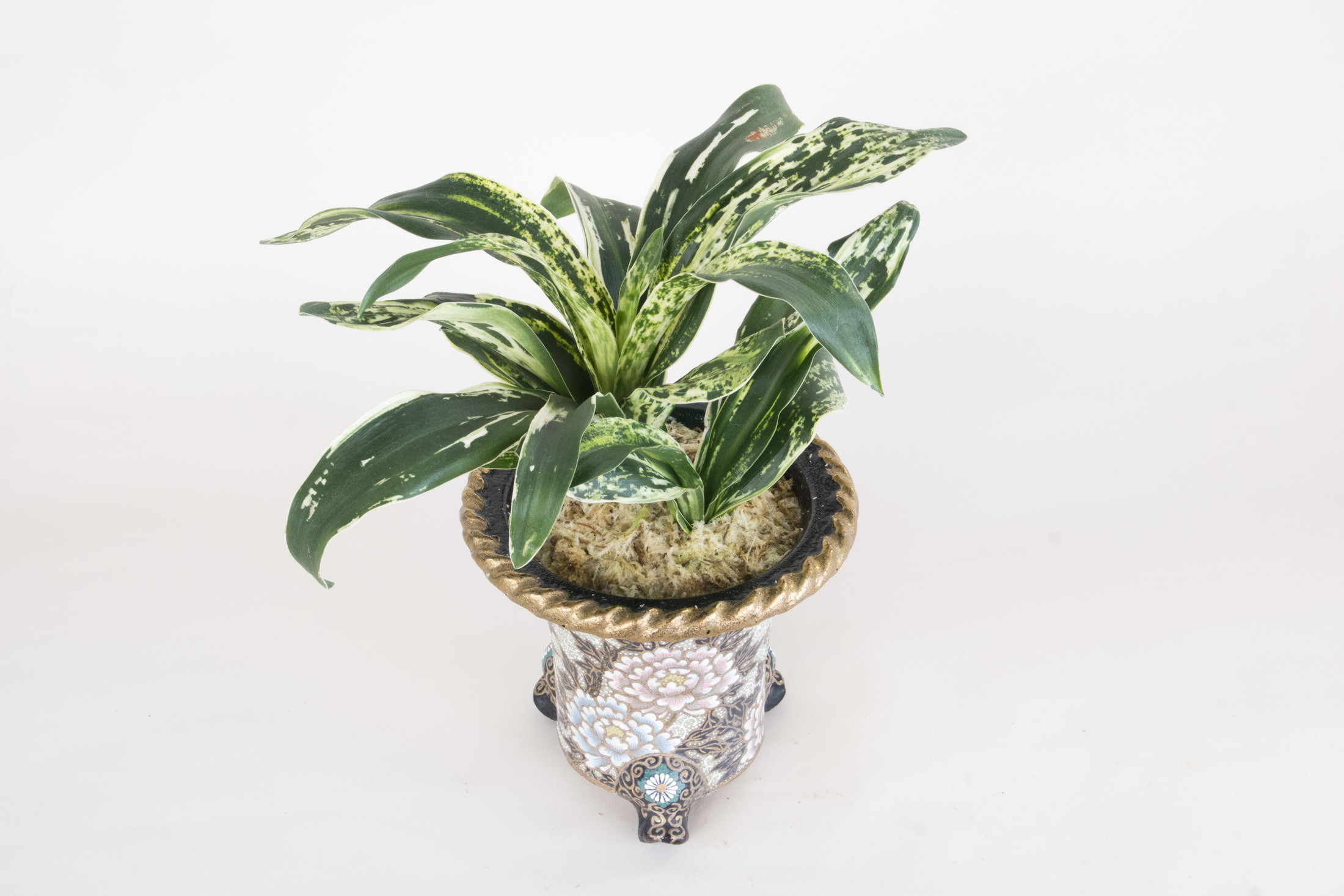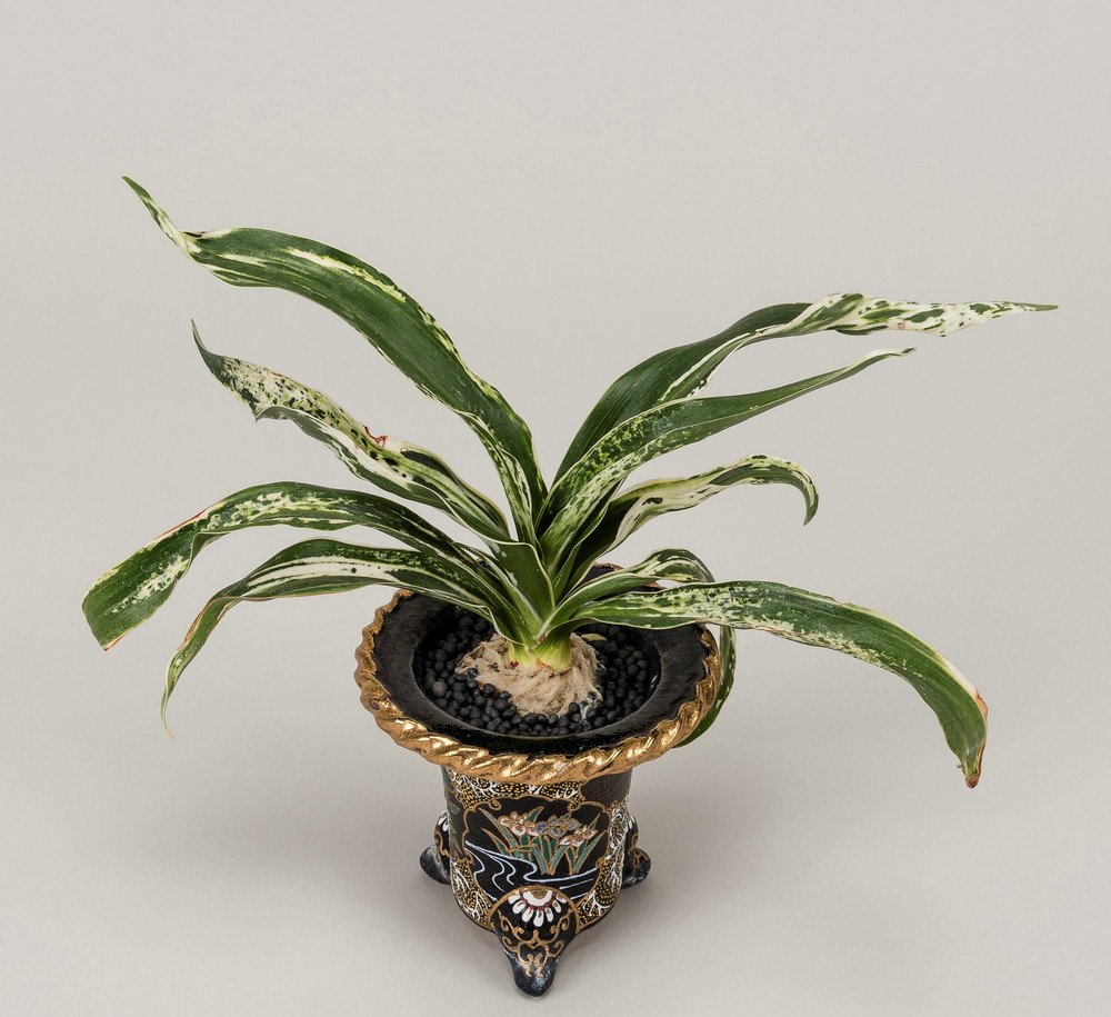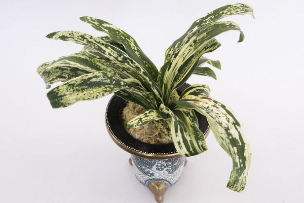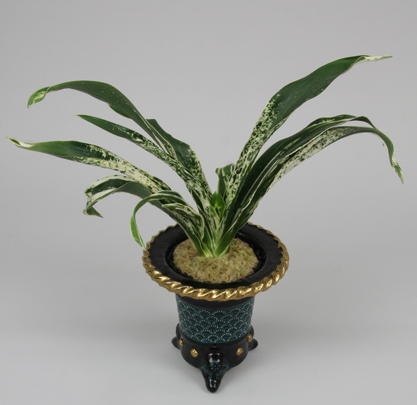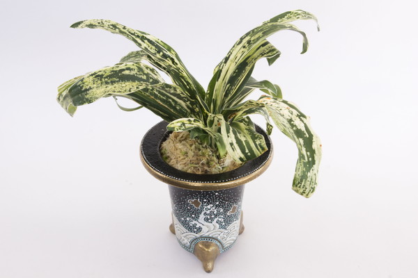 濃紺緑色の中立ち葉に図柄を見せる品種。葉は少し波を打ち葉先丸みをみせる。性質は少し弱い、子上しやすい品種。