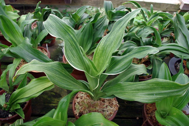 投稿日: 2018年11月6日2022年2月22日 投稿者: 豊明園千代田都 (ちよだみやこ) Chiyodamiyako 分類 大葉系統 白斑系 作出年代 不明 登録 作出者 不詳 命名者 大山実 (東京都) 登録者 葉長40㎝葉幅8㎝内外 葉肉は厚く、葉全体に白斑を見せる。葉は少し波うち白覆輪を見せます。性質は強健で作りやすい品種。 千代田都(ちよだみやこ) 7月豊橋地方で昔からある品種。庭にあった物を掘り上げ1作した物。