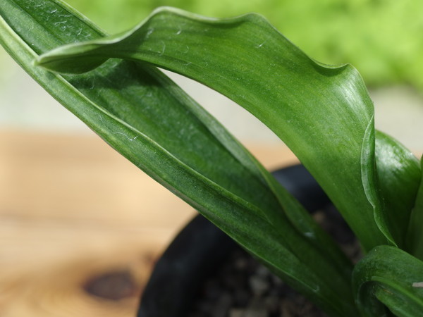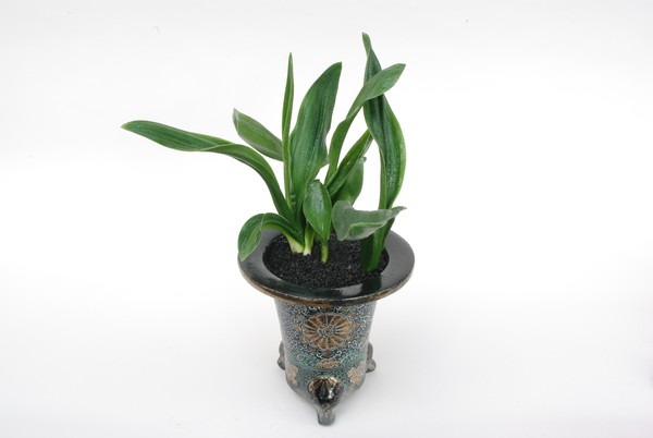 この万年青が折熨斗芸の元になっているおもとです。中型ですが、きちんと折熨斗の芸が見えると思います。古くは、天皇陛下お買い上げの万年青として、折熨斗縞(折熨斗に縞の入ったもの)とお多福が記録が残っており、由緒あるおもとです。この折熨斗も今の現役で実親として使えるだけでなく、価格はそこまでではないですが、今では非常に稀少な江戸万年青としても人気です。