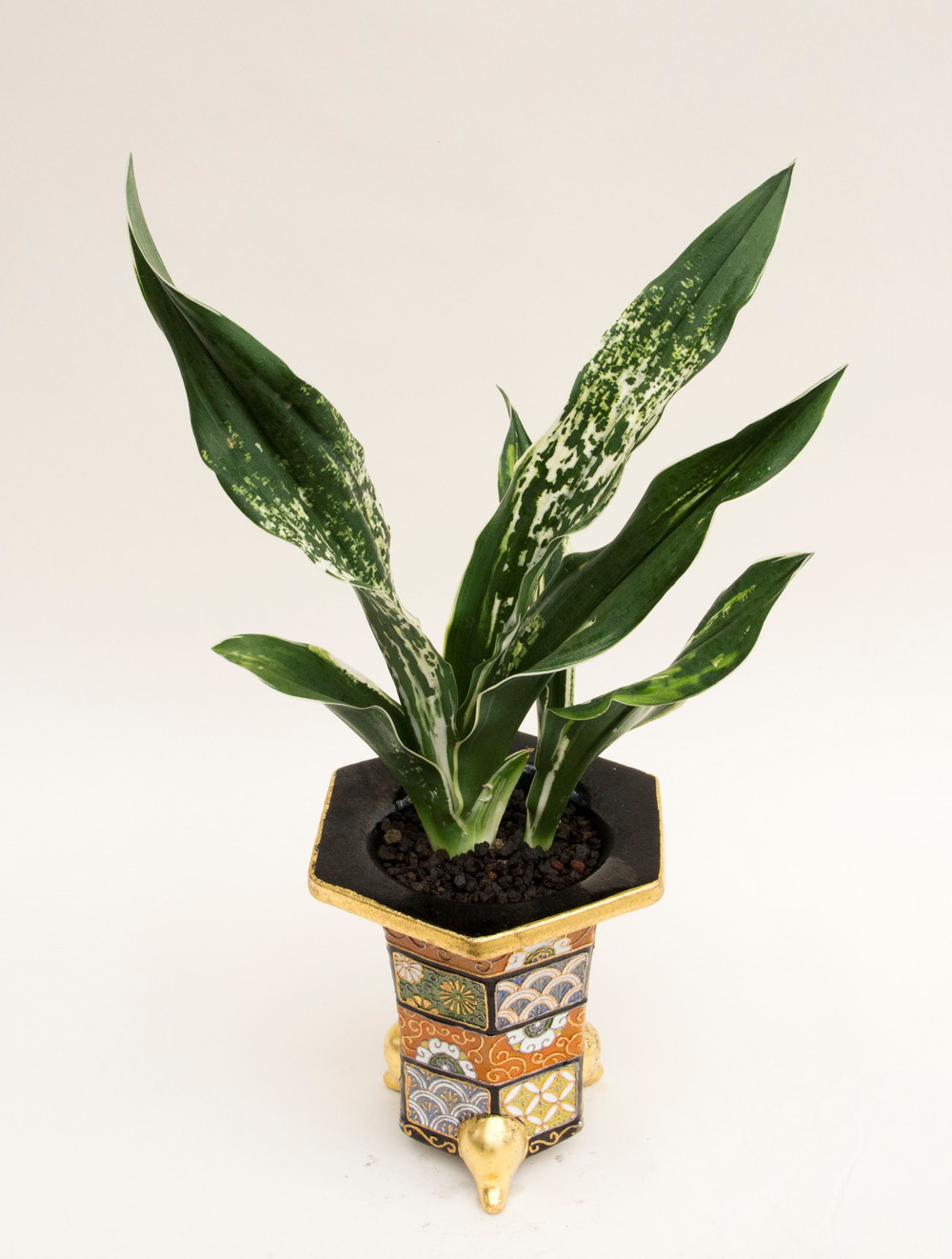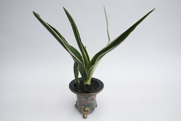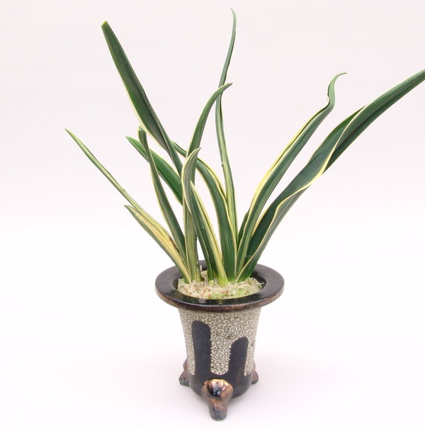 長寿楽 (ちょうじゅらく) 6年生 鉢14.5cm 手島鉢 雨垂れ唐草文様鉢 裏芸系の大型種 濃緑色で立ち葉性、葉長20㎝、葉幅4cm内外、若い1~2年の内は白覆輪だけ見せます。年がたつに従って棒状の立ち葉となり、葉の裏側に櫛ですいたような白い緻密な総雅糸竜を現し独特の葉姿を見せる。性質はやや弱い。