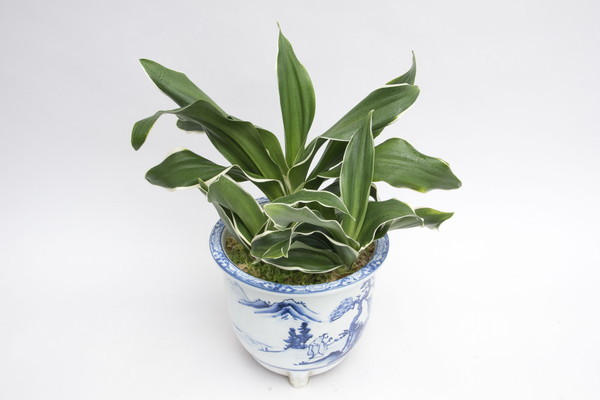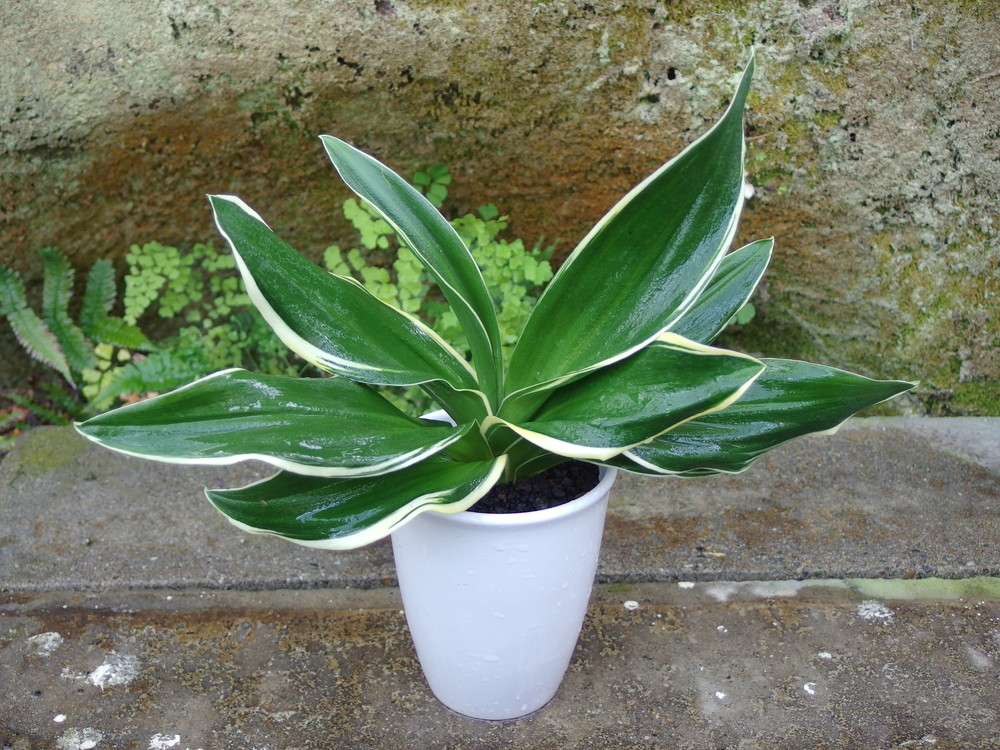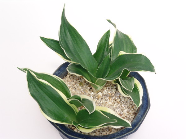 梨地葉で濃紺緑色の葉に純白の覆輪で覆います。葉幅広く少し波打ちゆったりとした葉型。性質は強健で繁殖良く。露地植えでも良く出来ます。