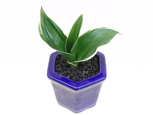梨地肌に濃紺緑色の葉と白い覆輪を楽しむおもと。江戸時代より続くおもと 中型種で濃緑色の葉に白い鮮明な覆輪を見せる。