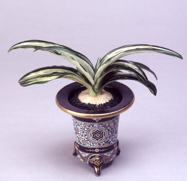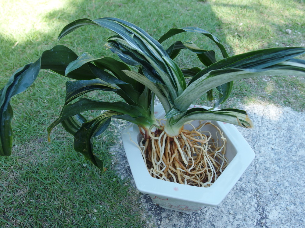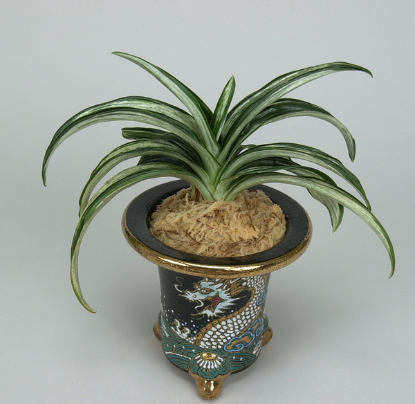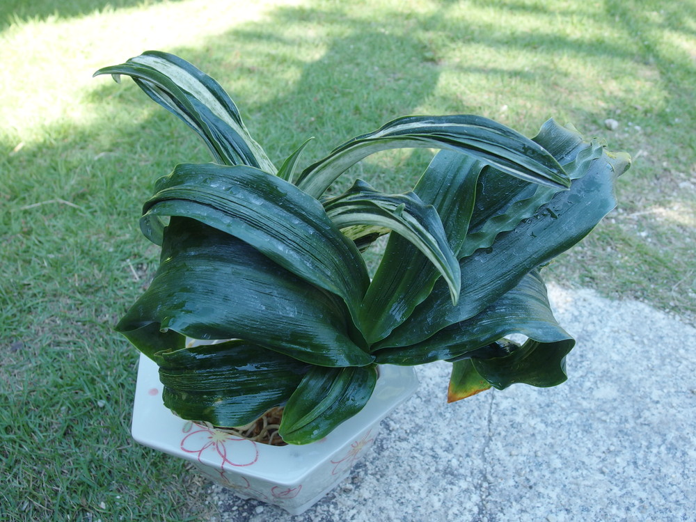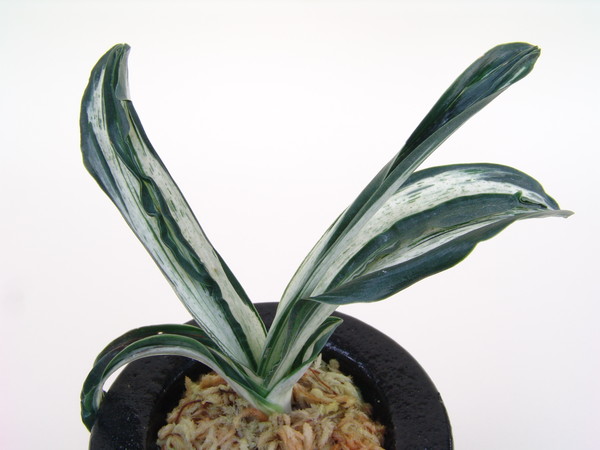 葉長15㎝、葉幅3㎝内外。葉繰り良く、中立ち葉で乱れのない葉姿は全体的にスマートで上品な感じを受ける。本種の千代田斑はこの系統の中でも最も白く、光沢のある濃紺緑色の覆輪は雪白な千代田斑を鮮やかに引き立たせる甲竜と低い雅糸竜、まれに玉竜も現す。斑が白いわりに育てやすい品種で、少々日強に作ったほうが力強さが出てきて中立ち葉のまとまりの良い葉姿になります。子上げ・芋吹きともに良く人気の高い品種。