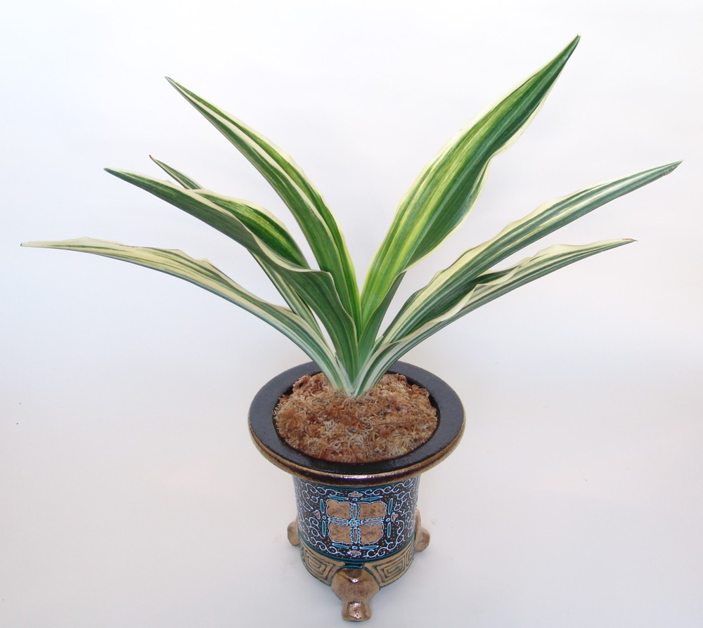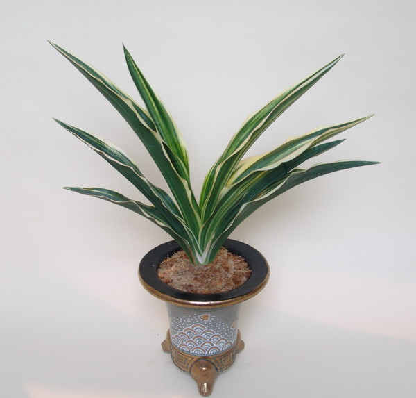 剣(つるぎ)大葉系の縞物の中でも、特長がある品種で、葉幅は広く、葉肉も厚い姿は、扇のように放射状に広がる姿は人の目を引く。葉先は鋭く直線的で力強く、まさに剣を思わせる豪快さを身に着けている魅力的な木です。縞覆輪は少なく貴重。多くは覆輪の木である。性質は強健で採光は強め。施肥は多めが良い。根が太いため肥料の吸収がよい。