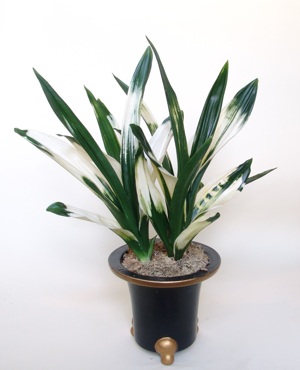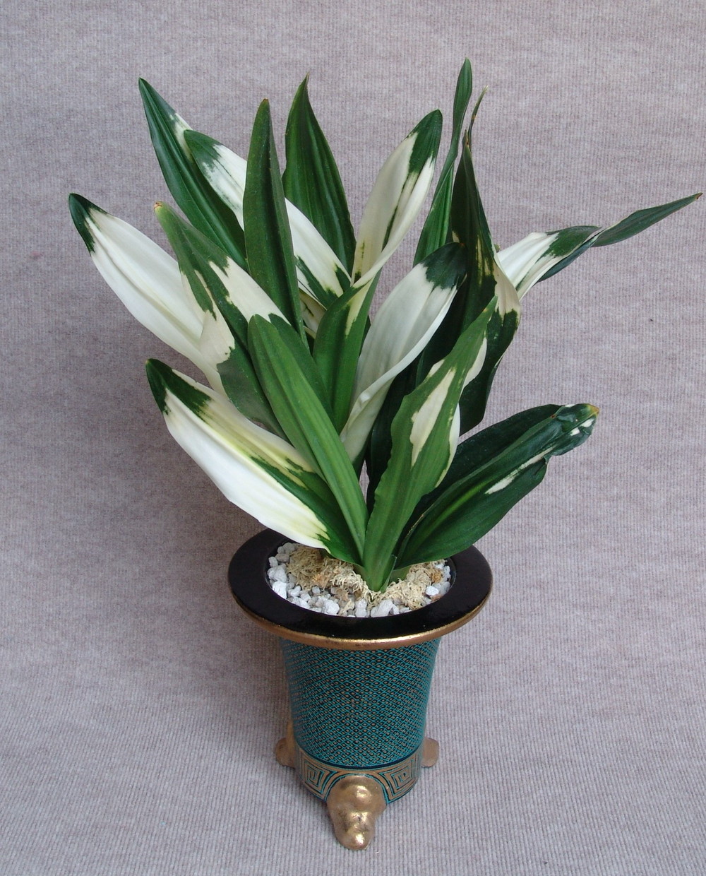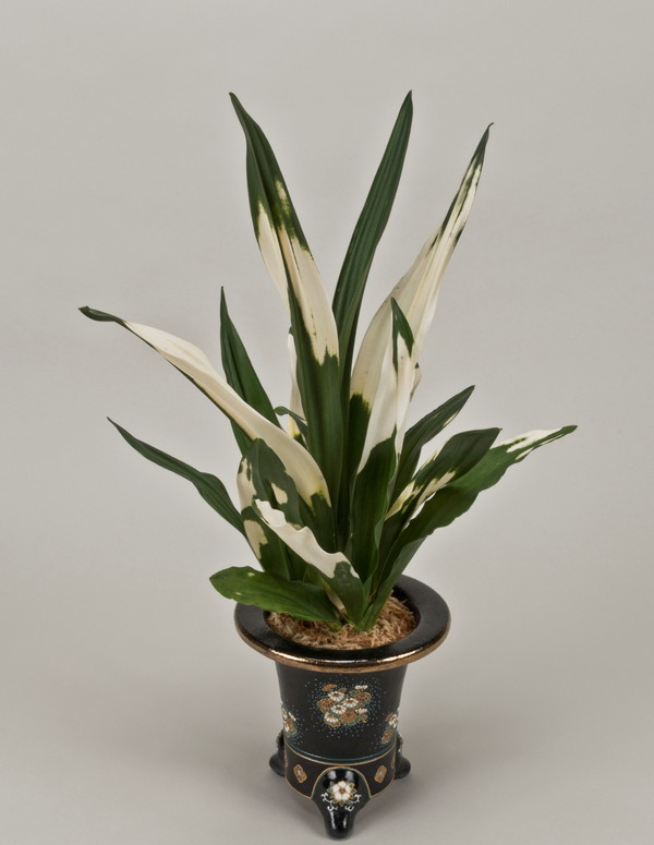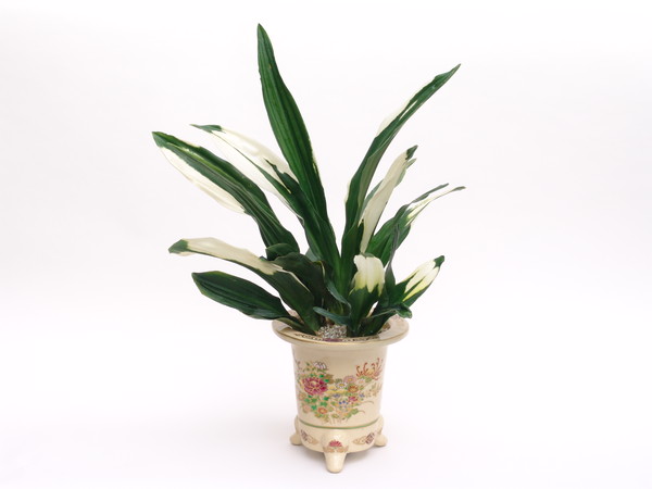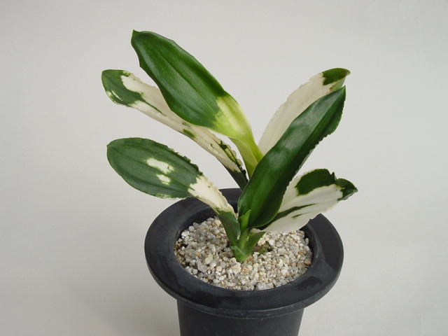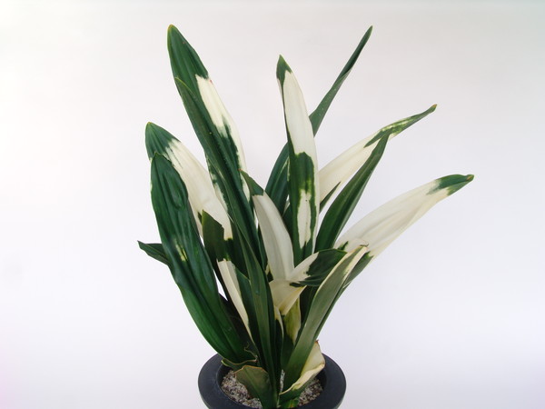 戦前『高隈の鷲』といっていましたが、薩摩万年青研究会が改名し、昭和32年、鹿児島市の松尾春好氏が同会に登録しました。大木の立ち葉性で葉長50㎝以上、葉幅8㎝内外。濃紺の緑地で葉肉は厚く、葉先は丸く、縦波のはいる平葉に雪白の虎斑が鮮明に大小さまざまな形で現れます。