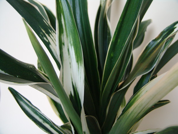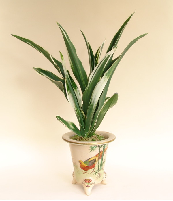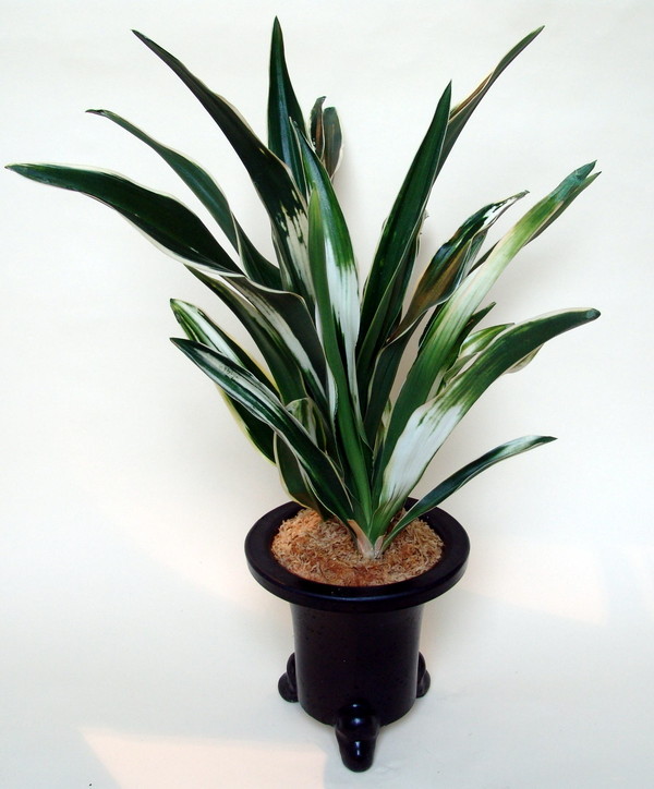 『都の城』の雪白の覆輪、濃緑色の地に白虎が現れたおもと。葉姿は立ち葉・豪快で美しく、性質は大変強健で作りやすい品種。