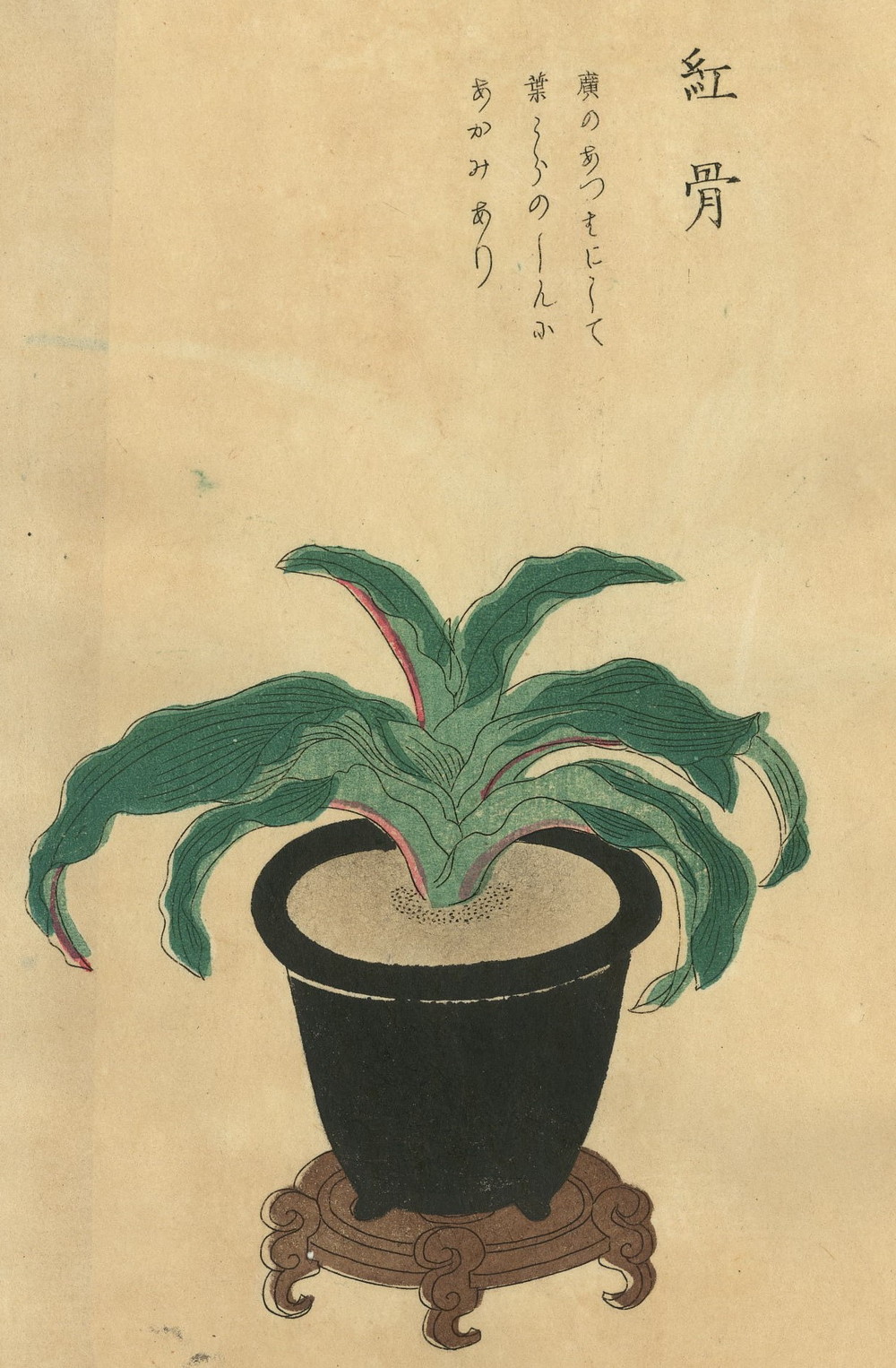 紅色の斑を差す珍品種で、明治期の文献に掲載がある古典品種。冬になると葉裏の中央部、背骨とよばれる部分に紅を差すことから当時は「紅骨」(こうほう)と呼ばれていた。現存する個体は希少。薄葉柄物。中型種。葉裏に斑が現れるので、裏芸の一種になる。葉は薄く地合いは淡く、うねりがある。決して丈夫な品種とはいえないが、芸のでにくさ、希少さから挑戦者が絶えない幻の品種。