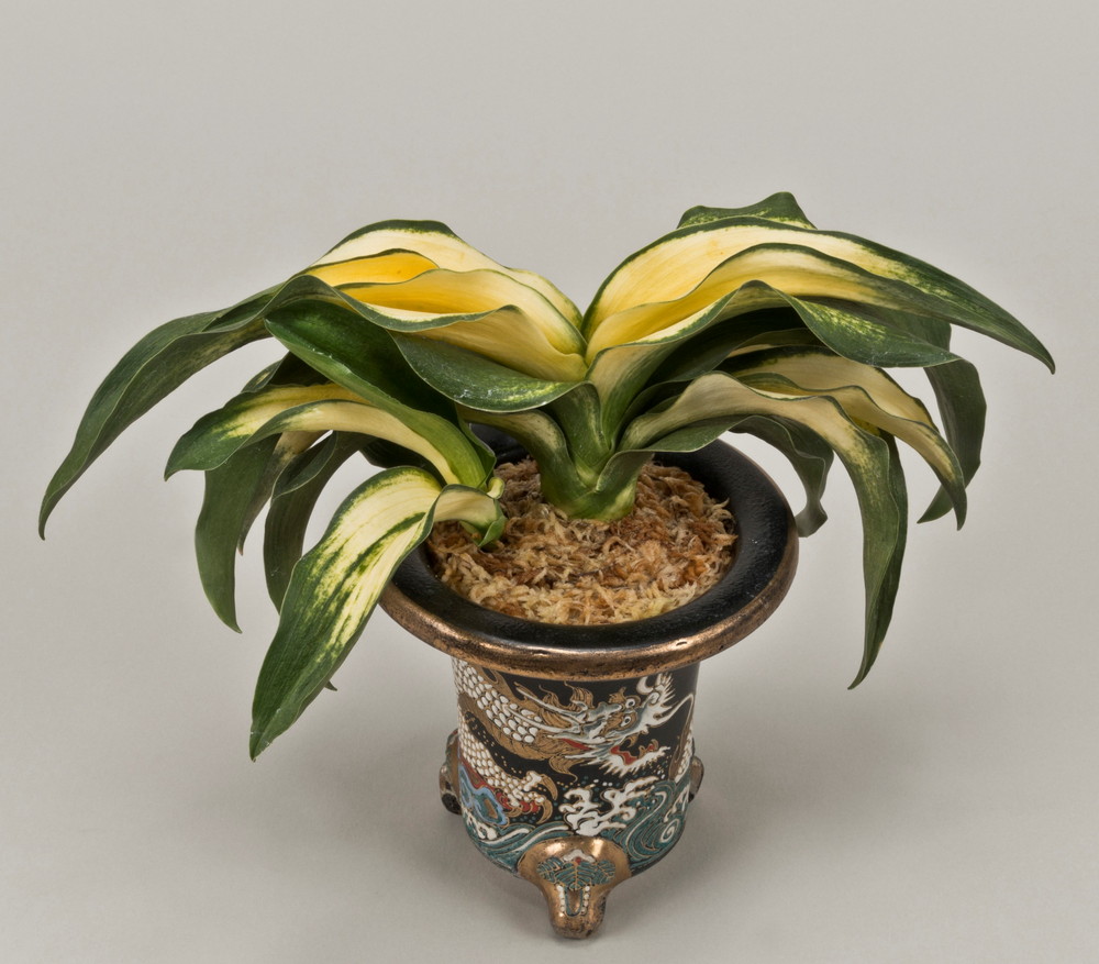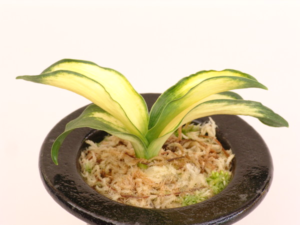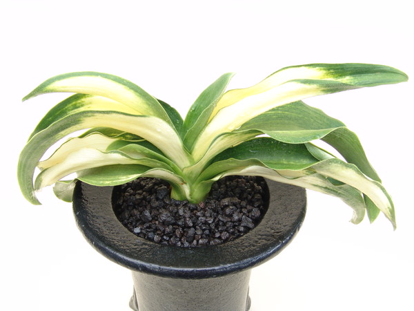 葉先尖る広葉で紺覆輪に縁取られた白黄色の 曙柄は非常に美しく、見飽きることがない。