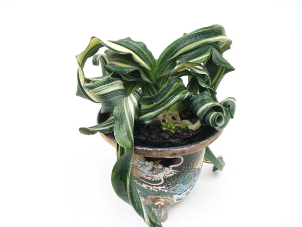 濃紺緑色の葉は広い、甲竜と低い雅糸竜を見せます。葉は角巻きの葉でボリュウムがあります。性質は強健で作りやすい品種。現在は図の現れていない物が多いです。