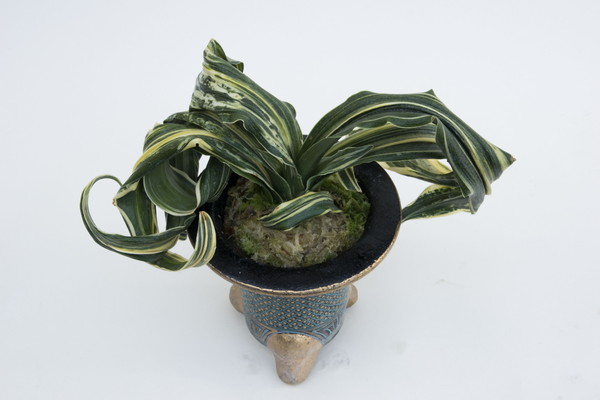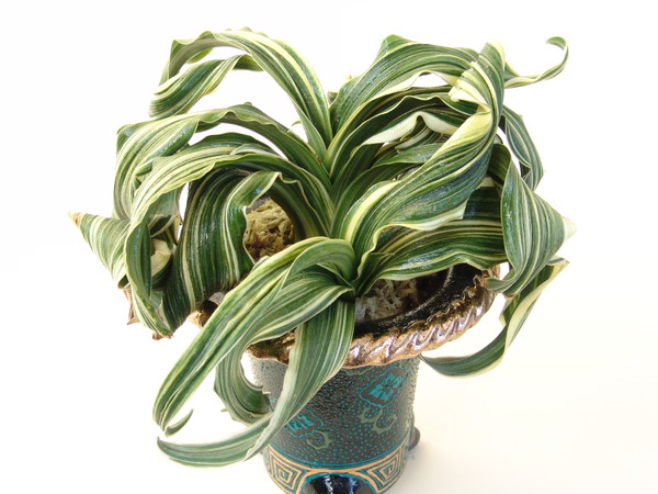登録当時には鮮明な図を現していたもので、本種は縞覆輪に図を現しているものが本種の特徴であるが、図が安定せず、現在図が確認できる品は少なくなってしまいました。しかし図がなくなっても巻の良い肉厚の姿にはボリュームがあり、十分観賞に値する。葉幅は広く覆輪も深いので、縞柄を現したものは美しい。葉芸としては少し高い二面竜が主体であ。性質は強健、繁殖も普通で、施肥・採光も普通で良い。