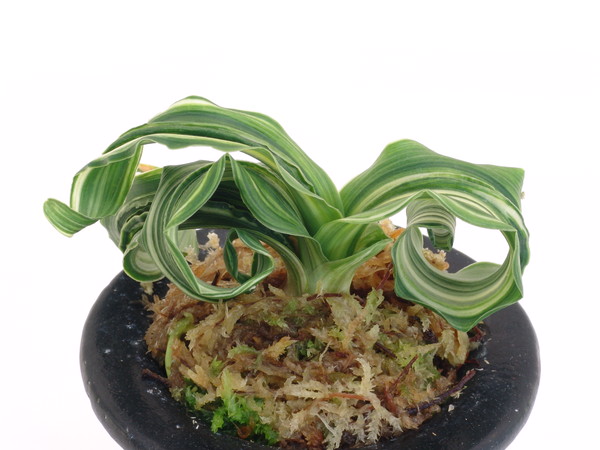 葉幅が広く、二面竜、総雅糸竜、鎌葉、剣葉、折熨斗竜のような剣葉を現し、獅子つしては多芸品といえる。甲竜は高いが、葉の巻き方はそれに負けず完全に巻き込み、獅子としての魅力は十分である。葉肉が厚く地合いも固いのでどっしりとした重量感がある。縞覆輪が最高の魅力だが、縞だけの物、覆輪だけの物もあります。性質は強健、葉肉もあるので採光は強めにする。施肥も強め。繁殖は芋吹かしが最適。