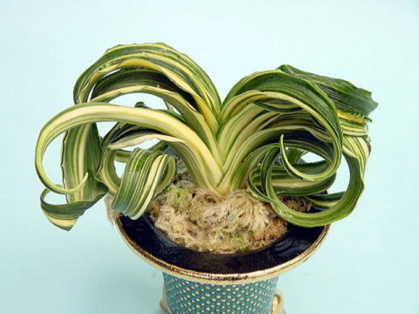 濃紺の照りのある地合いで、葉幅はやや細く葉先は尖る。雅糸竜、玉竜、甲竜を現すし、円を描くように巻き込む。腰が高く葉の巻きと調和がとれて、時に剣葉を現す。縞は乳白色で、濃紺色とのコントラストが良く魅力的である。獅子系統の中では全体のバランスがとれて、端正な葉姿で人気が高い。縞甲竜の獅子のため、性質は強健です。採光・施肥ともに普通。