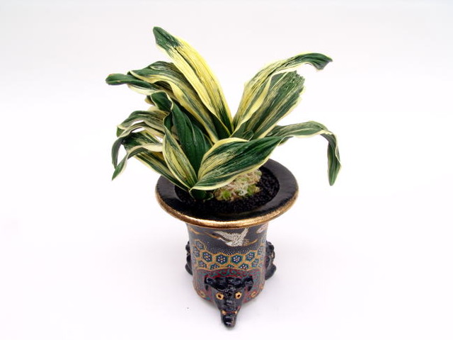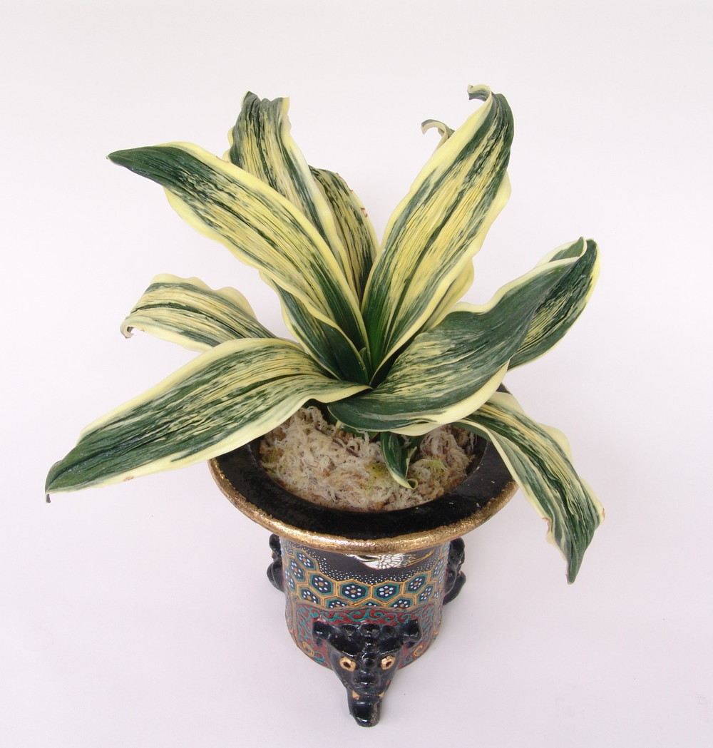 「太陽」の特徴 錦麒麟 型羅紗の腰太で力強さがある。覆輪は黄白色で成木になると広葉一面黄金色に輝く。柚子肌の雅糸竜、玉雅糸竜を現し美しくよくわかる。実親としても交配しやすく結実も良い。性質は強健で育てやすく、繁殖は普通である。