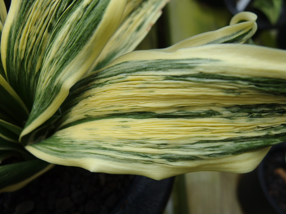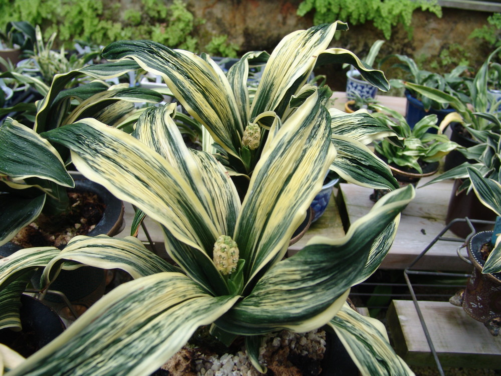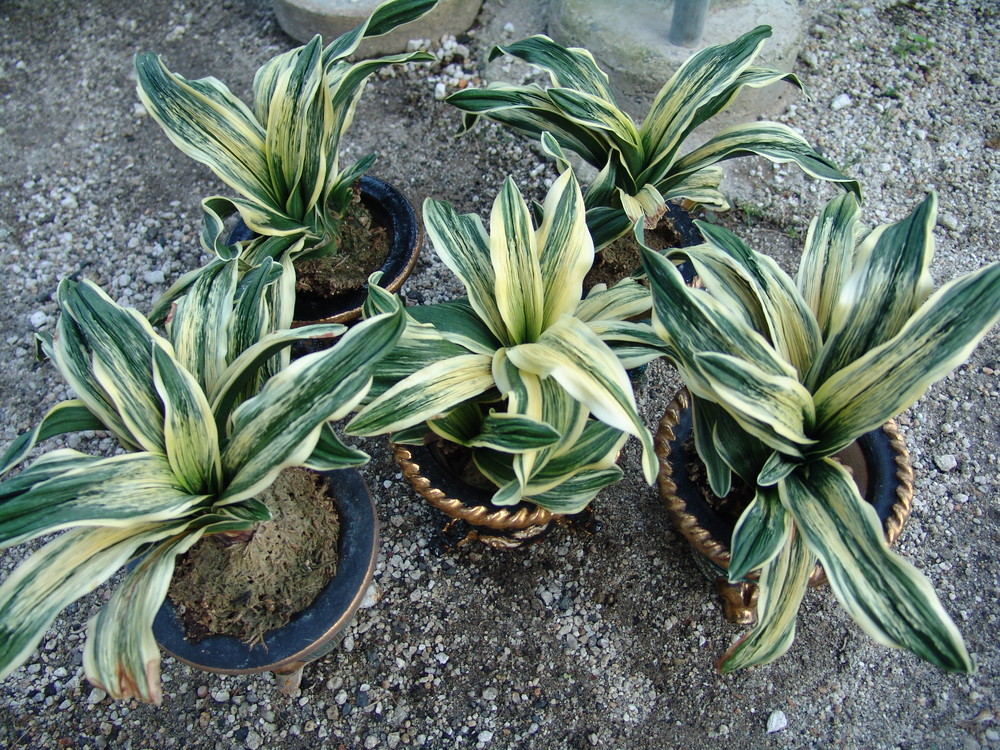 太陽 もとは実親なので、縞覆輪も大切にされています。覆輪が深い黄金色の雅糸竜も昇っていない葉があります。交配として生えた実生は、目を付けてもらうまで、ただラベルが錦麒麟×福寿龍、となっているだけの実生です。毎年、豊明園だけでも1~2万粒近く蒔きますので、すぐに選抜がかかり、約半年で10分の1から100分の1へ減っていきます。その基準は様々で、葉肉や姿、芸、柄、独特の特徴を持っているか、など多くの基準で選抜していきます。太陽が生えたときは、おもと界が羅紗全盛の時代で、中型になりそうなこの実生は、その選抜からは落とされてしまいました。ですが、葉肉や姿がよかったこの実生は、まず、実親(交配の親)として育てられました。