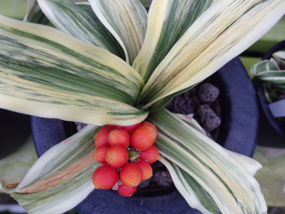 おもと太陽(たいよう) 6月8日 実が膨らんできました。交配が良くできたことが分かります。この状態になれば上から水をかけます。又雨にも当てても良い。