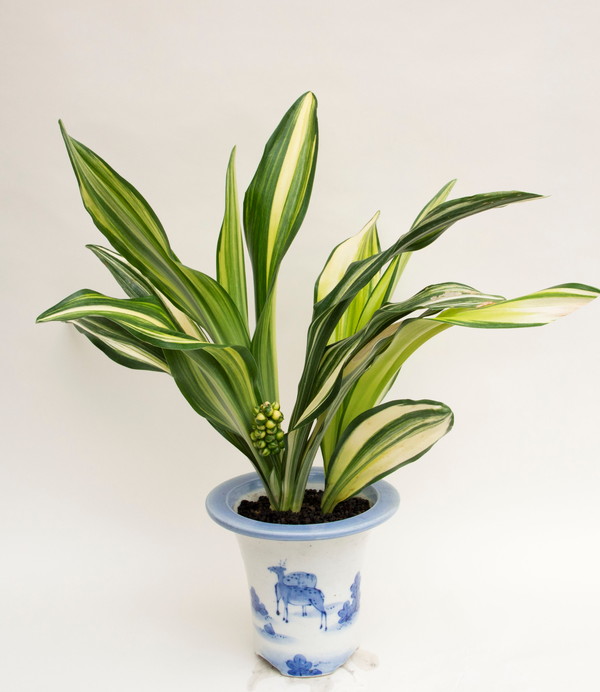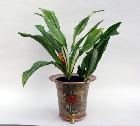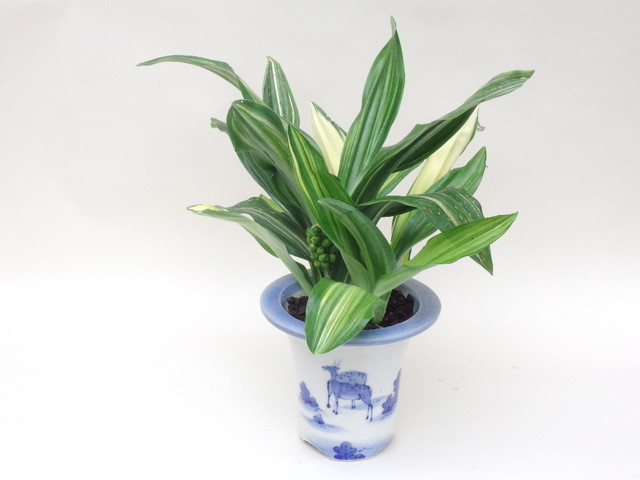 大象観の青葉は正月おもとの生け花に良く使います。鉢は薩摩焼の古鉢江戸時代のおもとは青い葉のおもとが主体でこの様な縞柄が美しく入るおもとは珍しいです、『草木錦葉集』にも見られ珍重されていたことが見受けられます。広い葉巾は少し波葉を見せる。