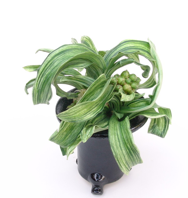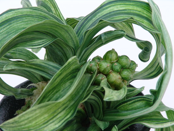 葉長18㎝、葉幅5㎝内外の白斑系獅子。首元太く、幅広の葉がおおらかに柔らかく巻き込む。白斑は明るい、中に緑色の筋が線のように見せる。