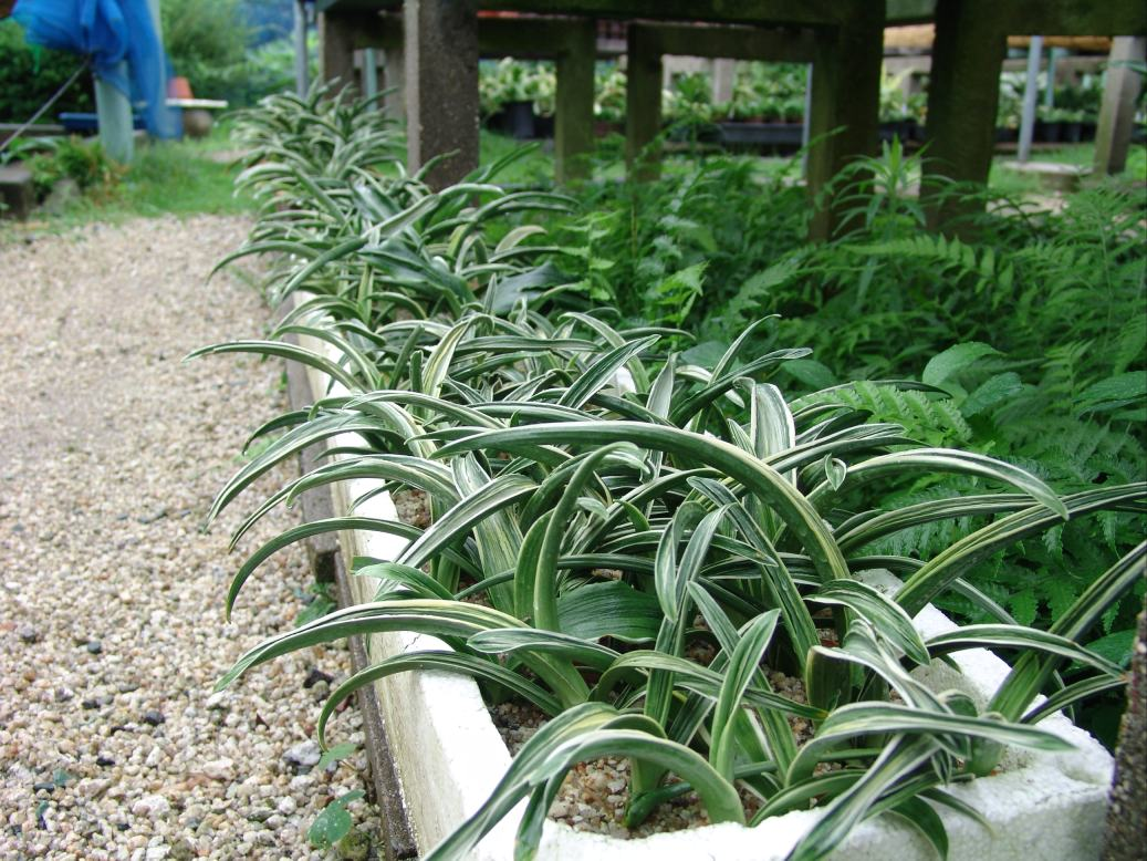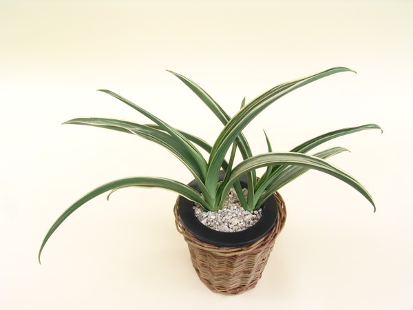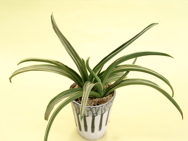 地変縞甲竜型。中型種。濃緑色の葉はなめらかな艶があり、白の覆輪が太くかかる。甲竜、雅糸竜の芸を現すが、多くは中細の樋葉となる性質は丈夫で繁殖も良い。実付きの良い品種。露地植えでもよくできる。