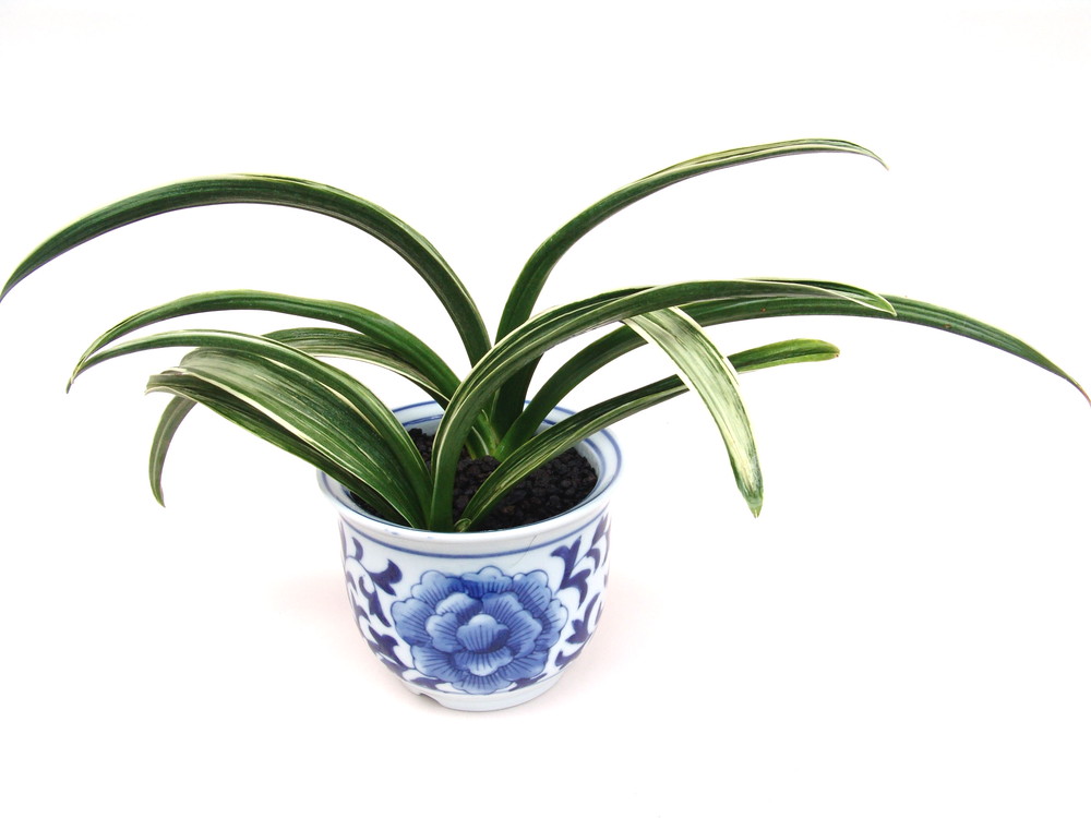 中型種。濃い緑の葉は樋葉を主とし、中腰です。深い覆輪がかかり、地はなめらかで艶があります。性質は丈夫で作りやすく、繁殖は特に良い。