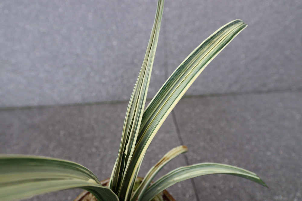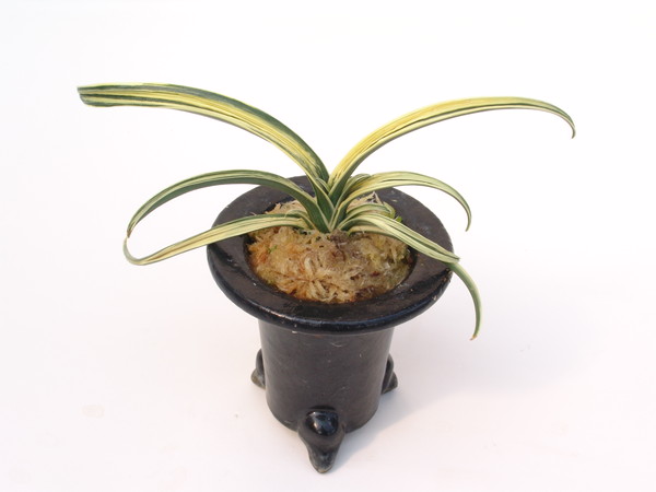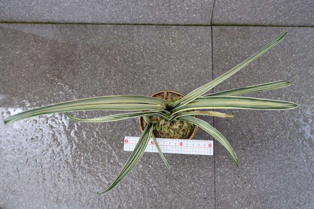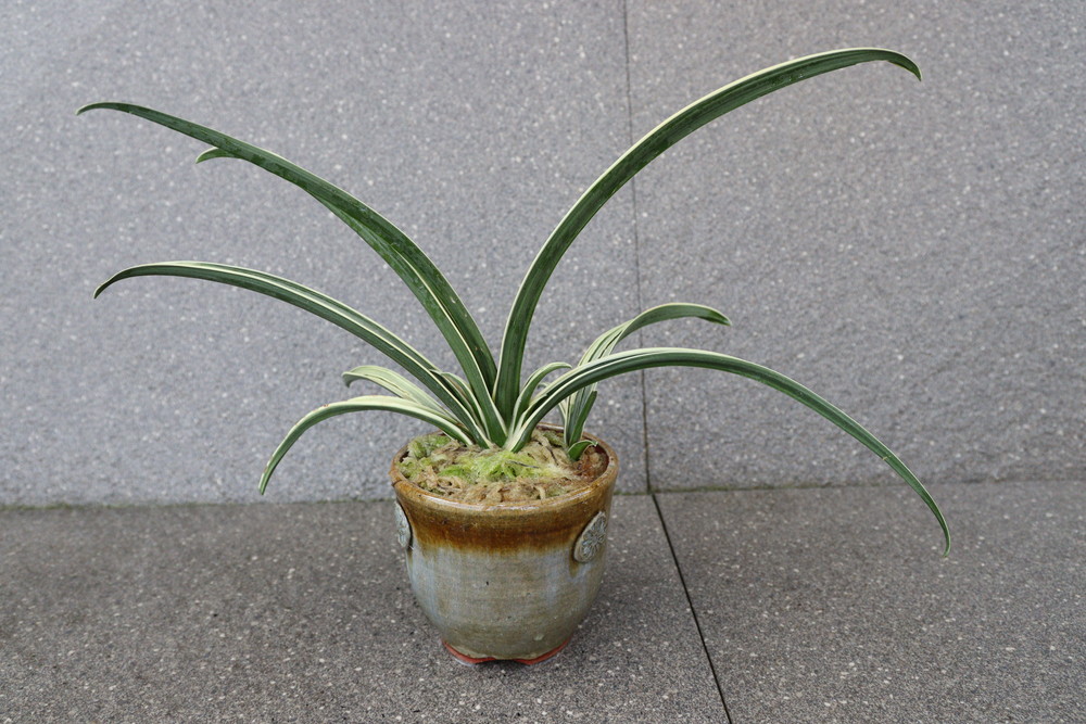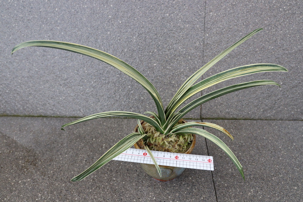 青海波(せいがいは) 5年生 中型種。濃緑色の葉は、ほっそりと曲線を描いて気品良く樋葉となって、櫛ですいたような総雅糸竜が葉全面を覆う。乳白色の深い覆輪を現し、折り下げの良い左右の均整のとれた端正な葉姿で、あたかも貴公子の風格で魅了される。性質は至って強く、採光は十分に行い、肥料もやや強めに与えると十分に芸を現す。鉢はなるべく小さなものを使用して栽培すると、葉芸は特に良くなる。繁殖も良好で、子上げも良い。