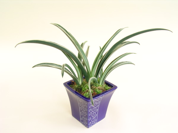 中型種。濃紺のおびた地に低い雅糸竜をひきつめます。樋葉性で葉先は鋭く尖り、葉幅は細めで襟組良く上品で美しい品種です。性質は丈夫で作りやすい品。