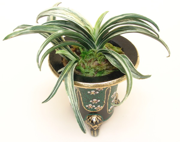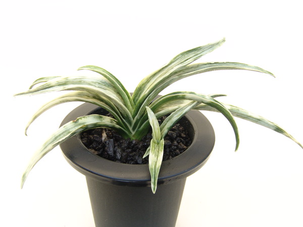 縞甲竜系の中では小型種。『雪渓錦』の芽変わり。濃紺緑色の葉は地合い良く、樋葉となって雅糸竜を現す原木の『雪渓錦』が、栽培中に根変わりして雪白の矢筈斑が出現したもの。根変わりしたためか、原木に比べて小型となり、葉姿も変化して全く違う姿となる。性質は至って強く、矢筈虎を鮮明に現すためにも、施肥・採光・通風は他の品種に比べて強めにする。繁殖は旺盛で作り易く、入門者にも大変楽しめる品種である。