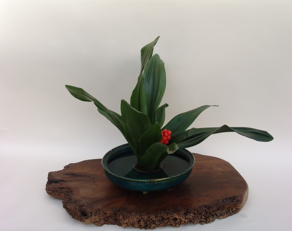 岡崎 豊明園の正月 葉10枚、実1つを付け生ける。 池坊、七種伝の伝花とされて一種で生けます。年中青くて枯れることがなく千々孫々まで繁栄する」ということで、正月の生け花として。