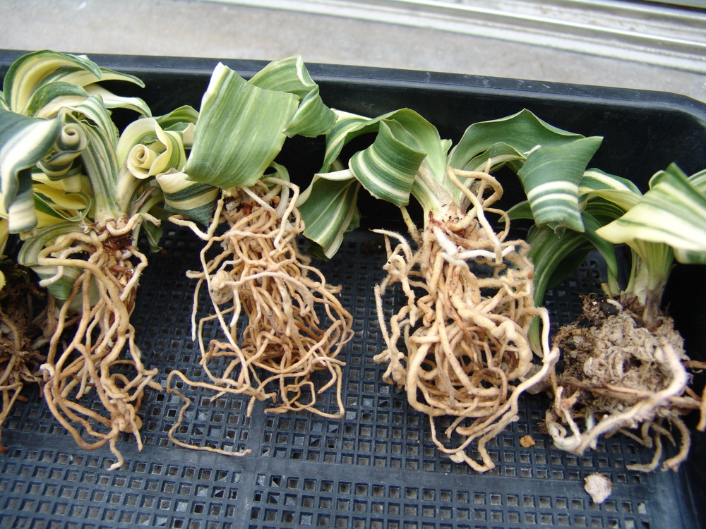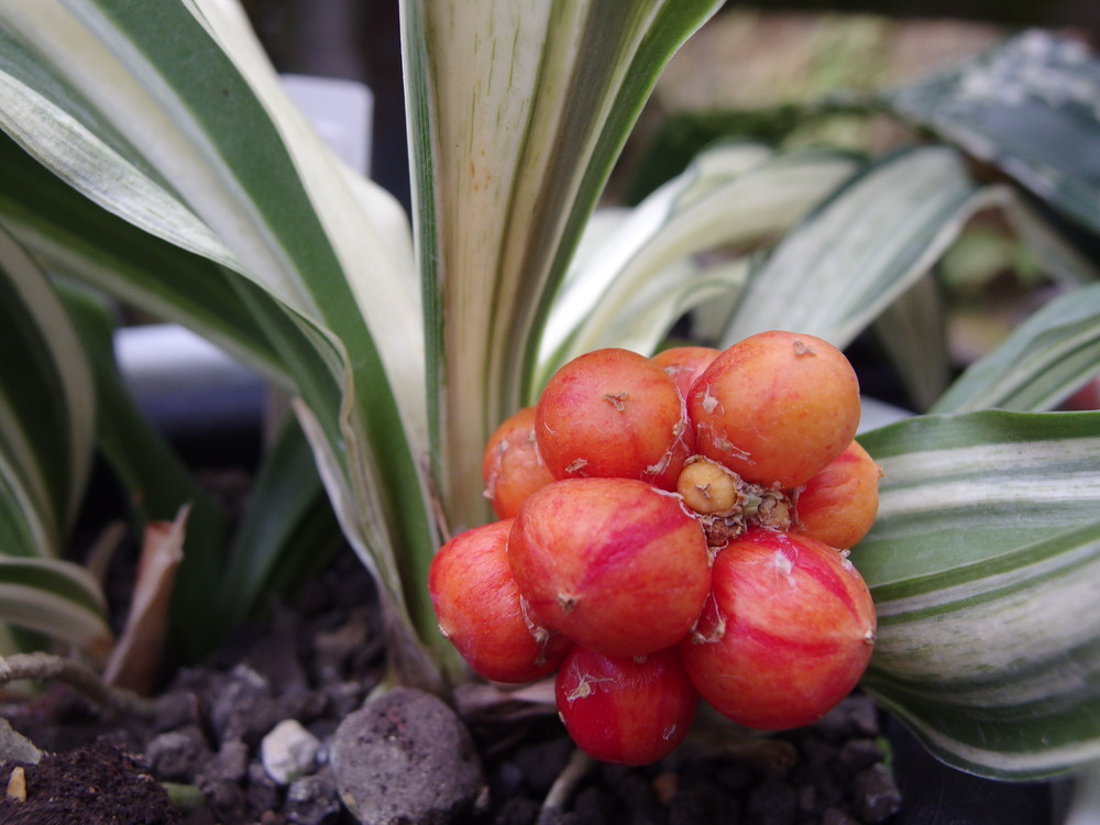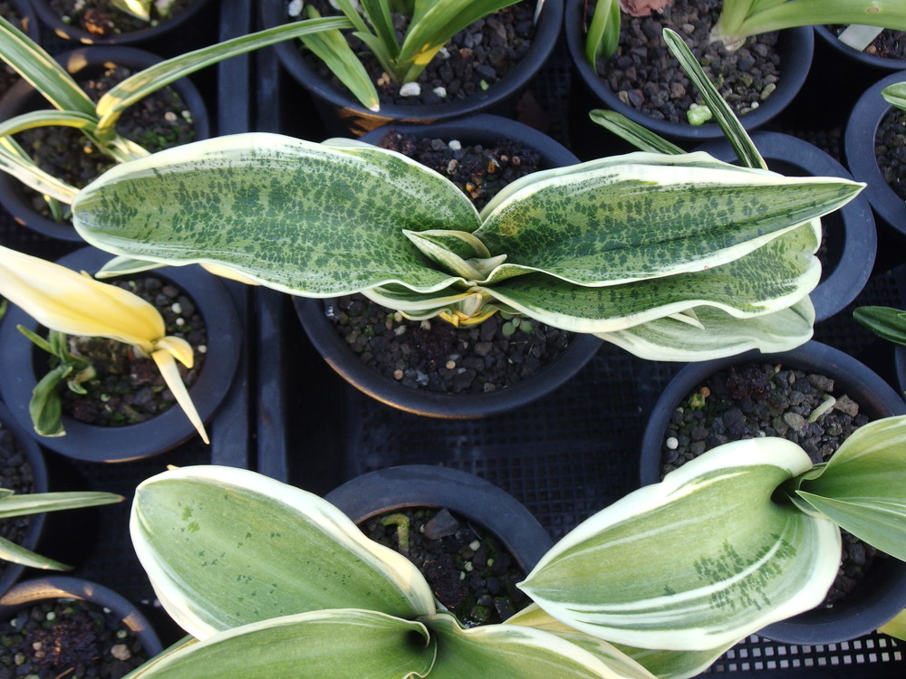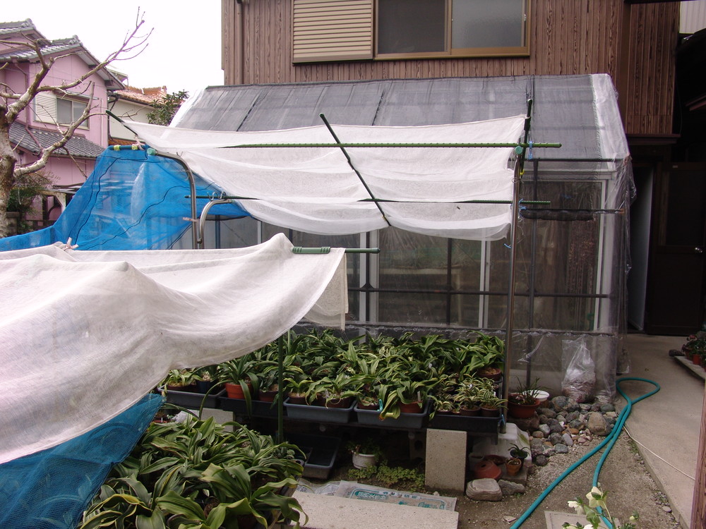 夜間も天窓は開けた状態で管理しています。外の外気温と同じです、温室内は横窓がしめてあるため湿度があります。大葉系統は不織布の下で管理します。葉が垂れないようにするため。垂れたもとは棚の下へ置きます。1月の潅水は温室内では7日を目安にオモト鉢の状態を見ながら行います。外で管理しているオモトは晴天が続くと上渇きするので晴天の日を見て換水します。