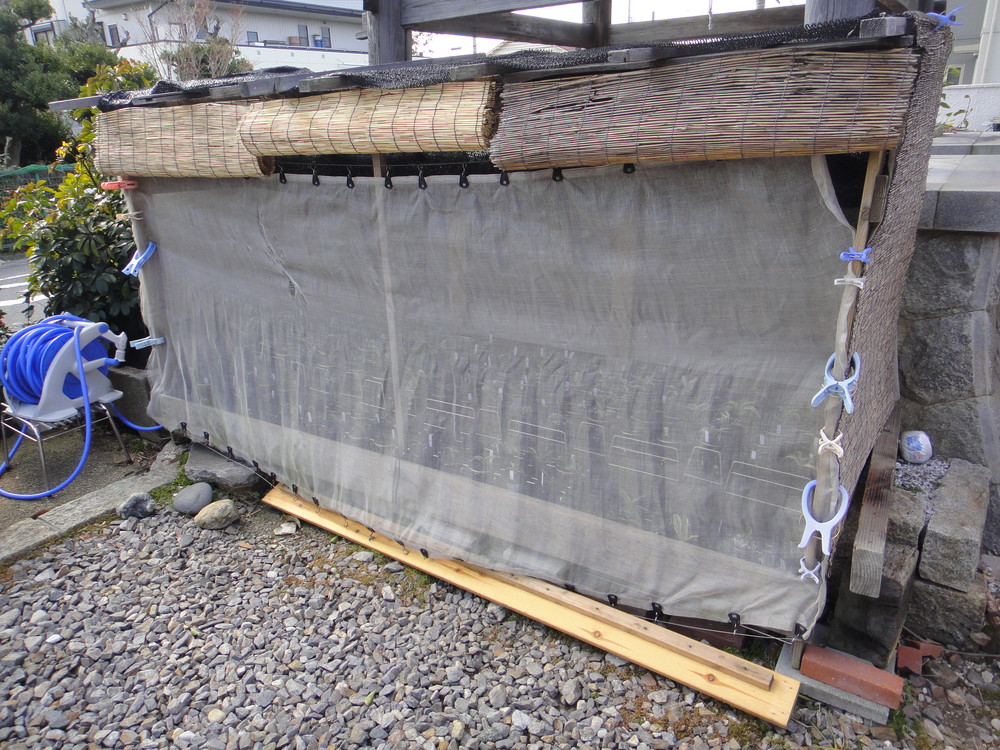 屋外の棚に置く場合は、寒冷紗・不織布などで囲い風を防ぎます。寒風に当たると葉の縁や葉先が焼けて褐色になり、また虎柄・図柄の白い部分は焼けやすいです。棚下に置くが新聞紙を巻いて保護します。
