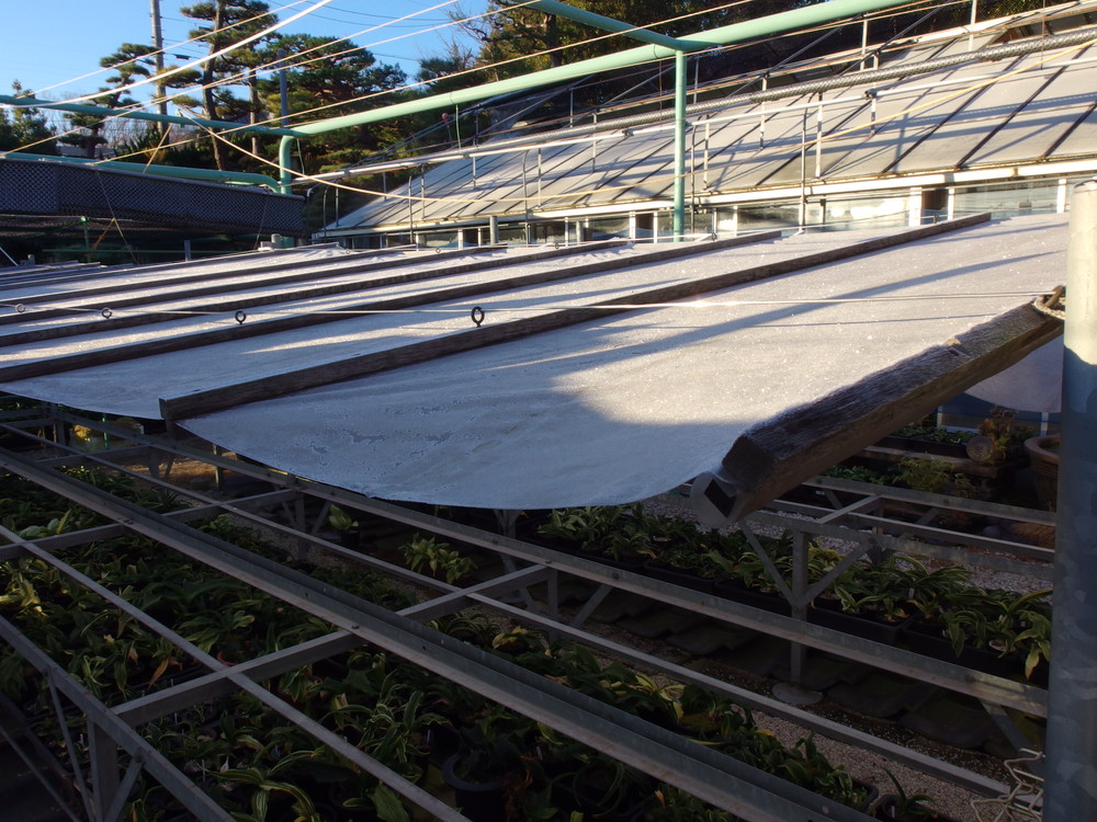 大寒波が来ていますね。おもとは寒さに強く、数回凍るくらいなら全く問題ありません。(自然のおもとは霜にあたっても元気です)ですが、凍ったおもとに直射日光が当たって一気に温度があがると組織が壊れてしまいます。凍って葉の色がどす黒くなったら、なるべく暗い場所でゆっくり解凍(?)しましょう。また、霜に当たらないようにネットを張ったり、温室の中でも、一枚新聞紙をのせておくだけで凍るのが防げます。豊明園では、この時期はしっかりと凍らせて、強い木を作るようにしています。スパルタ作りです。この時期に甘い作りをすると、夏の暑さに耐えられないようになってしまいます。