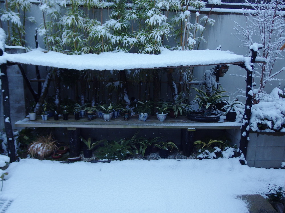 豊明園 外展示棚 雪が降りつもる時も、その場所に置き管理します。棚上が壊れそうな場合、上のものを取り外し雪にさらします。急に暖かい場所に移さない事。自然の寒さに馴らして管理しているおもとは丈夫です。