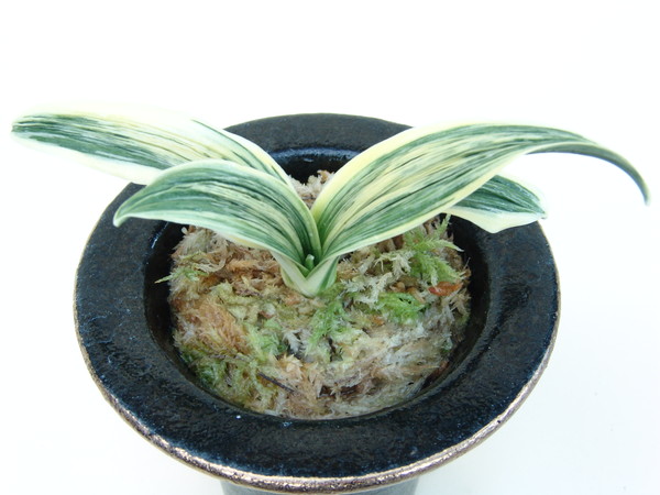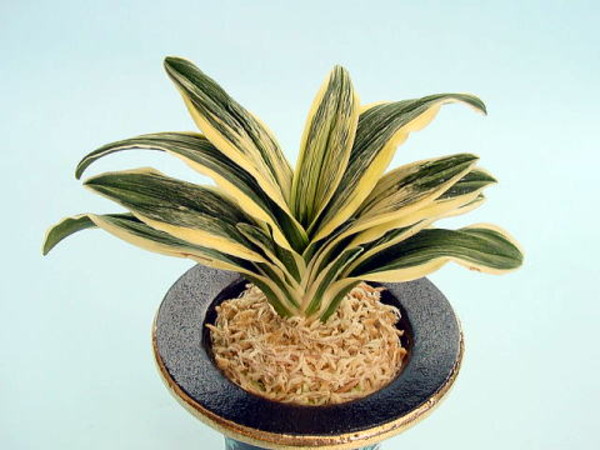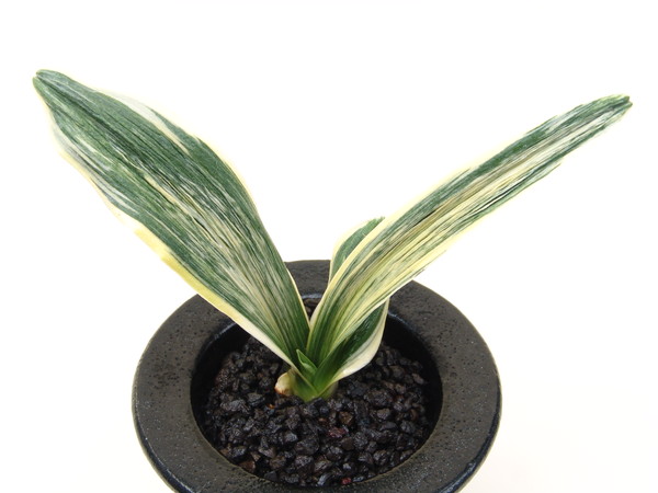 波涛(はとう) 7年生 鉢4.5号 葉長15㎝、葉幅4㎝内外の中型種。襟組の良い葉姿で、葉肉の厚い幅広い葉は、葉元から葉先まであまり変化せず、綺麗に開き深い乳白色の覆輪に細かい総雅糸竜が葉全面に覆い尽くすため、品が良く見ごたえがある。性質は強健で、採光、施肥ともに普通で、繁殖は良い。