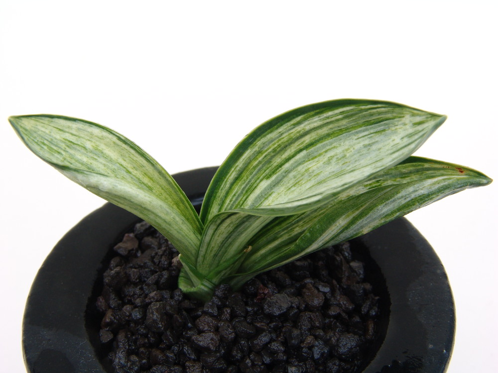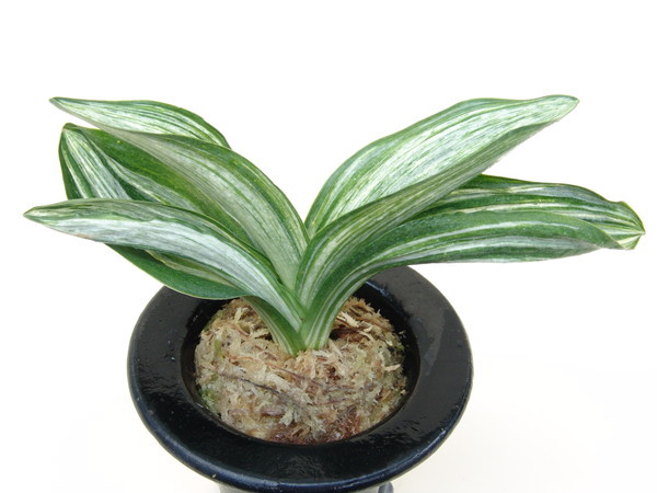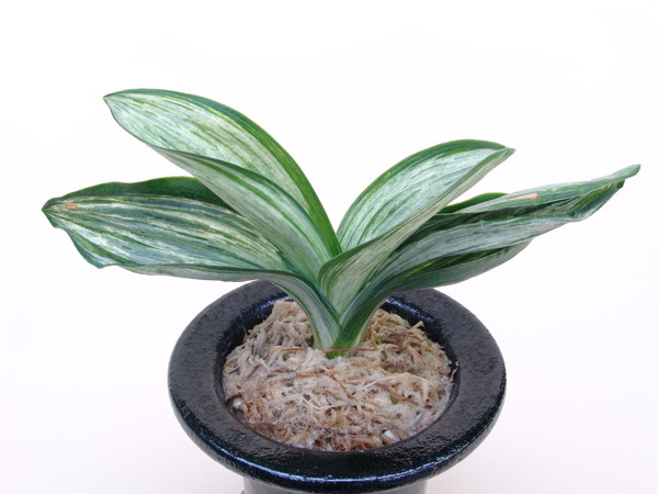 和羅紗地のふっくらした丸葉に白斑を現し紺覆輪を見せる。性質は普通、繁殖は芋吹き。