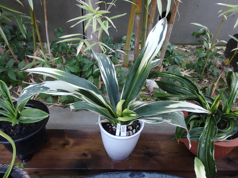 投稿日: 2018年12月9日2022年1月17日 投稿者: 豊明園白生玲 (はくせいれい) 分類 薄葉系統 江戸おもと 作出年代 不明 登録 昭和26年 作出者 不詳 命名者 不詳 登録者 久米武七 (愛知県名古屋市) 古くからあつた由。葉長40㎝、葉幅5㎝内外。濃緑色の葉で、葉先に丸みをもった平葉で、やや深い爪覆輪をかけ、葉先はやや垂れぎみ、雪白の虎柄は大きく現れたり吹雪状の様にも現れます、鮮明なもの不鮮明なものとまちまちです。採光を強めに管理すると白さが増します。