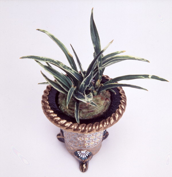 玉雀に雪白の鮮明の図の入るもの。『玉雀』は群雀の砂子覆輪で葉肉は厚く葉先は尖ります。葉の先端に雀の嘴のような形になります。『玉雀』の雀は、秋頃から段々と大きな玉を葉先に現す。採光は弱めに管理。秋肥えを早くするとよい玉が現れ、図もまた美しく現れる。