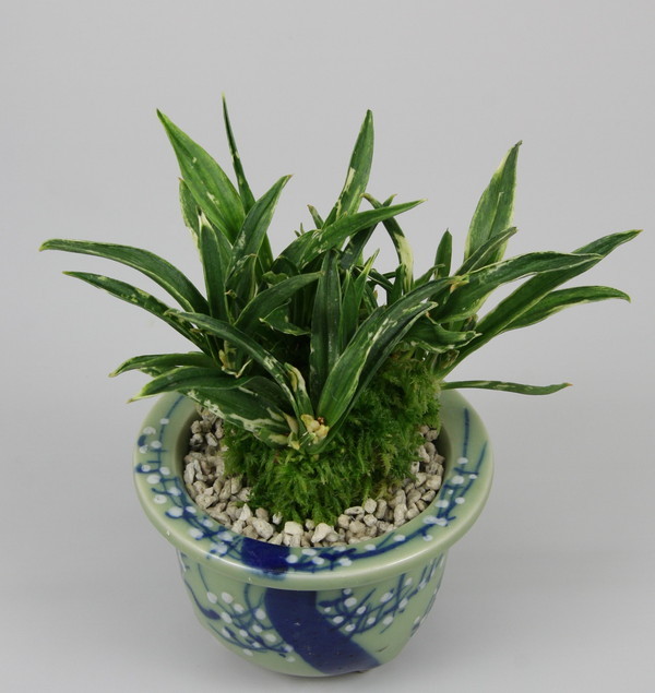 濃緑色の葉に砂子斑を現し葉に白い図柄を見せる。葉の先部分、雀のくちばしに似ているところを現した品種を群雀と呼びます。性質は強健で作り易く株立ちになりやすい。少し細かめな砂に腐葉土2割混ぜた用度にして作ると良く出来ます。