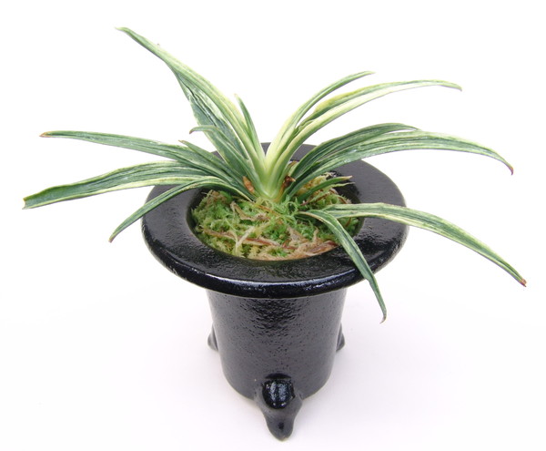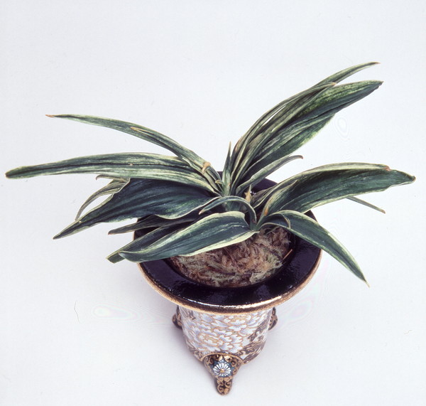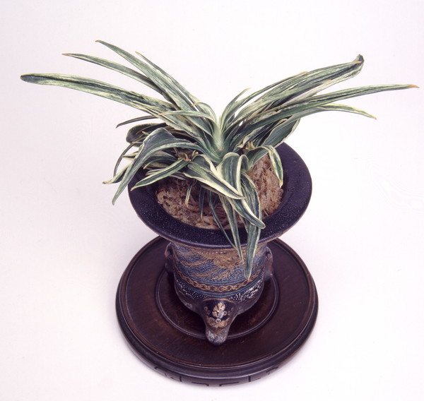 葉長8㎝、葉幅1㎝内外。光沢ある濃紺緑色の葉に、砂子大覆輪をかける。葉肉は厚く盛り上がる雅糸竜もみせる。葉先はするどく尖り葉繰りも良い。葉形の美しい品種。採光は弱め、施肥は普通。
