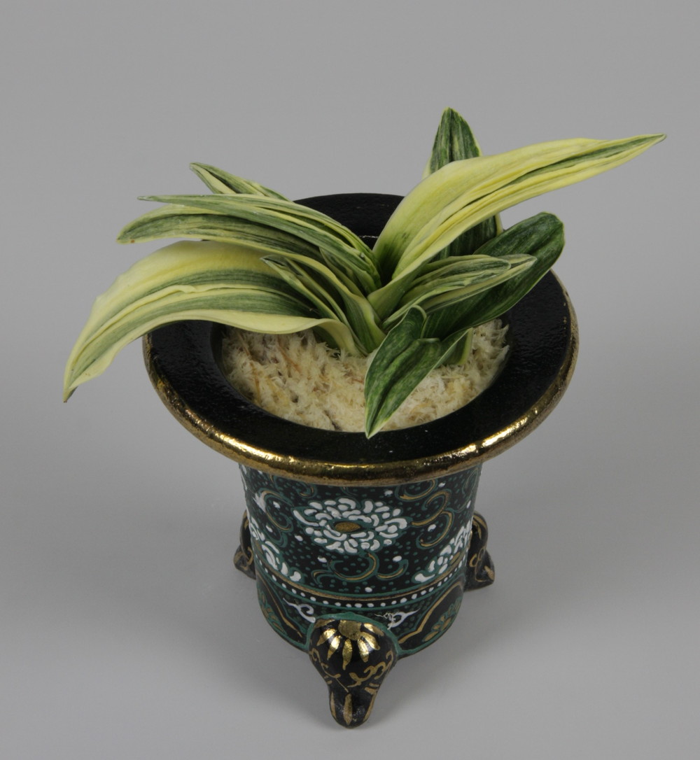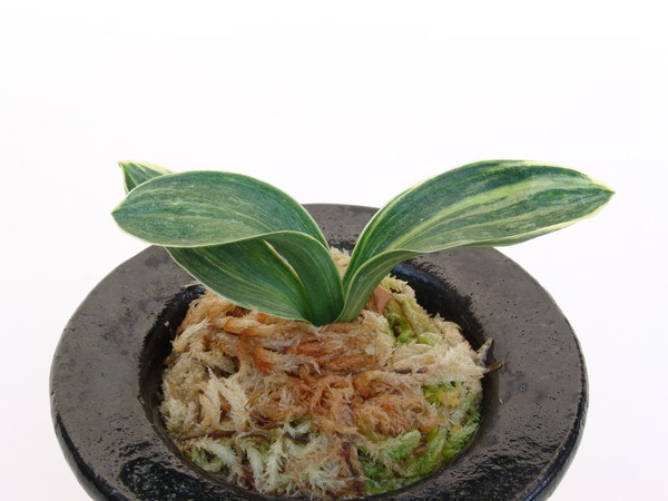 葉長8㎝、葉幅3㎝内外の胡麻斑系の中型種。『金剛錦』×『大宝』の交配により作出される。中立ち葉のバランスの良い葉姿に、鮮明な胡麻斑が美しく、深い白覆輪と見事に調和し、胡麻羅紗の魅力を最大限に生かした代表品種。低い雅糸竜に甲竜、跳ね竜、玉竜などの葉芸は多彩である。性質は普通で、子上げが良く、繁殖は良い。採光は、やや強めにするほうが胡麻斑が鮮明になり、葉芸も強くなる。施肥は中程度が良い。