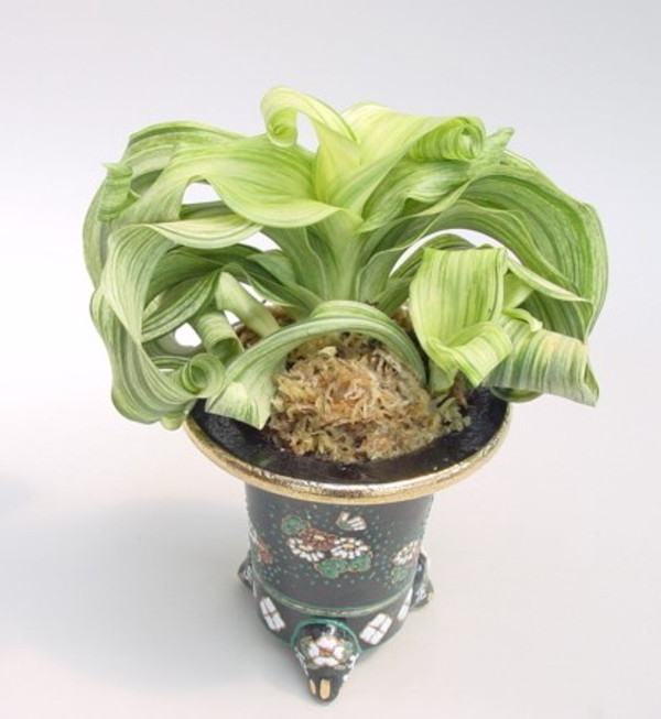 くっきりとした白斑柄と優しいおおらかな丸巻きを現し、獅子芸を容易に楽しめる品種。白い斑に巻き込む葉はボリュウムあり、子上げしやすく、性質は強健で作りやすい。実付き良い。採光は中、性質は中、肥料普通で栽培する。