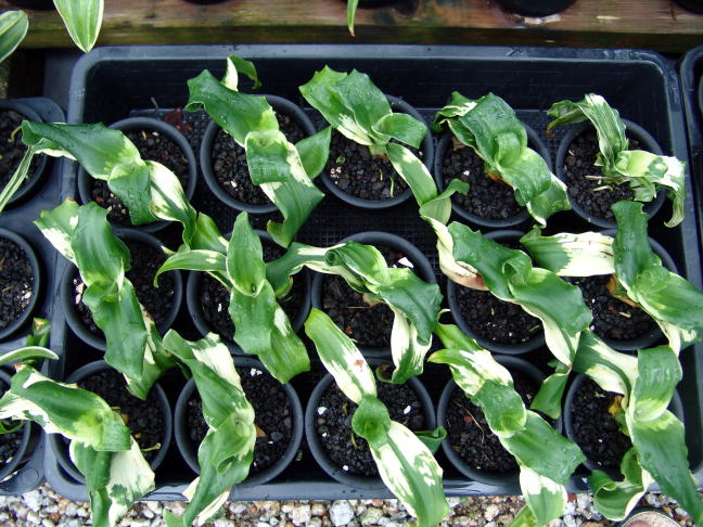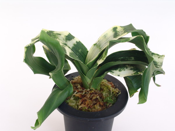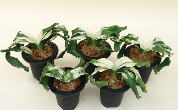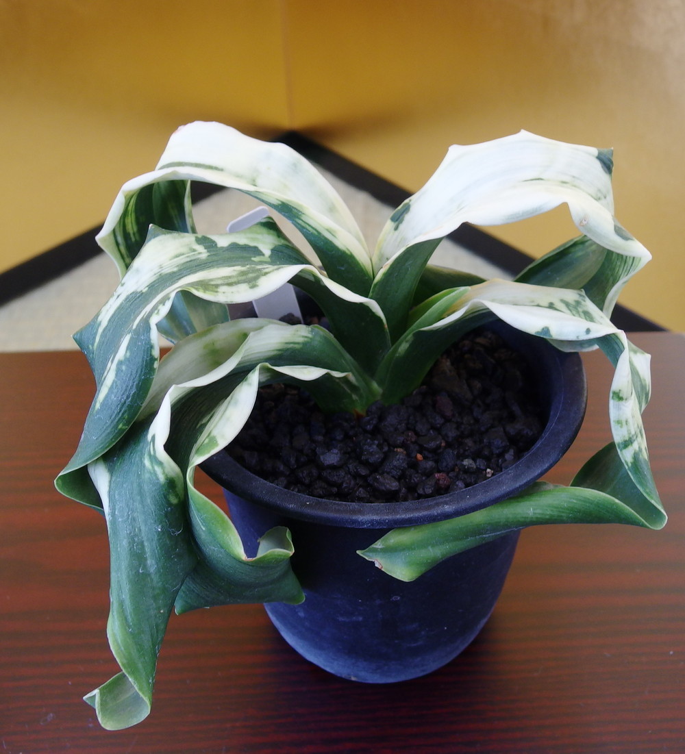 春雪(しゅんせつ)3年生 葉肉厚く全体に雅糸竜を見せる。出目の頃より午前中の採光を充分にすると白く美しい柄になります。白い矢筈柄が美しくなります。繁殖は良い強健品種。