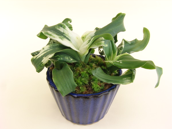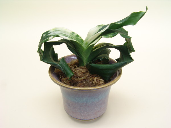 春雪(しゅんせつ)3年生 葉長13㎝、葉幅3㎝内外。矢筈縞甲獅子。艶消し地で、葉肉は厚くボリュームがあり、成木になるにつれて、雅糸竜が現れる。肉厚の葉のわりに巻が良く、円を描くように綺麗に巻き込む。採光を十分採ると矢筈柄がきれいに現れ、採光が弱いと矢筈柄が消え青くなる。しかし翌年また採光を十分採ると矢筈柄が戻ってきます。性質は強く、繁殖は良い。採光・施肥ともに強めが良い。初心者から手軽に楽しめる品種である。