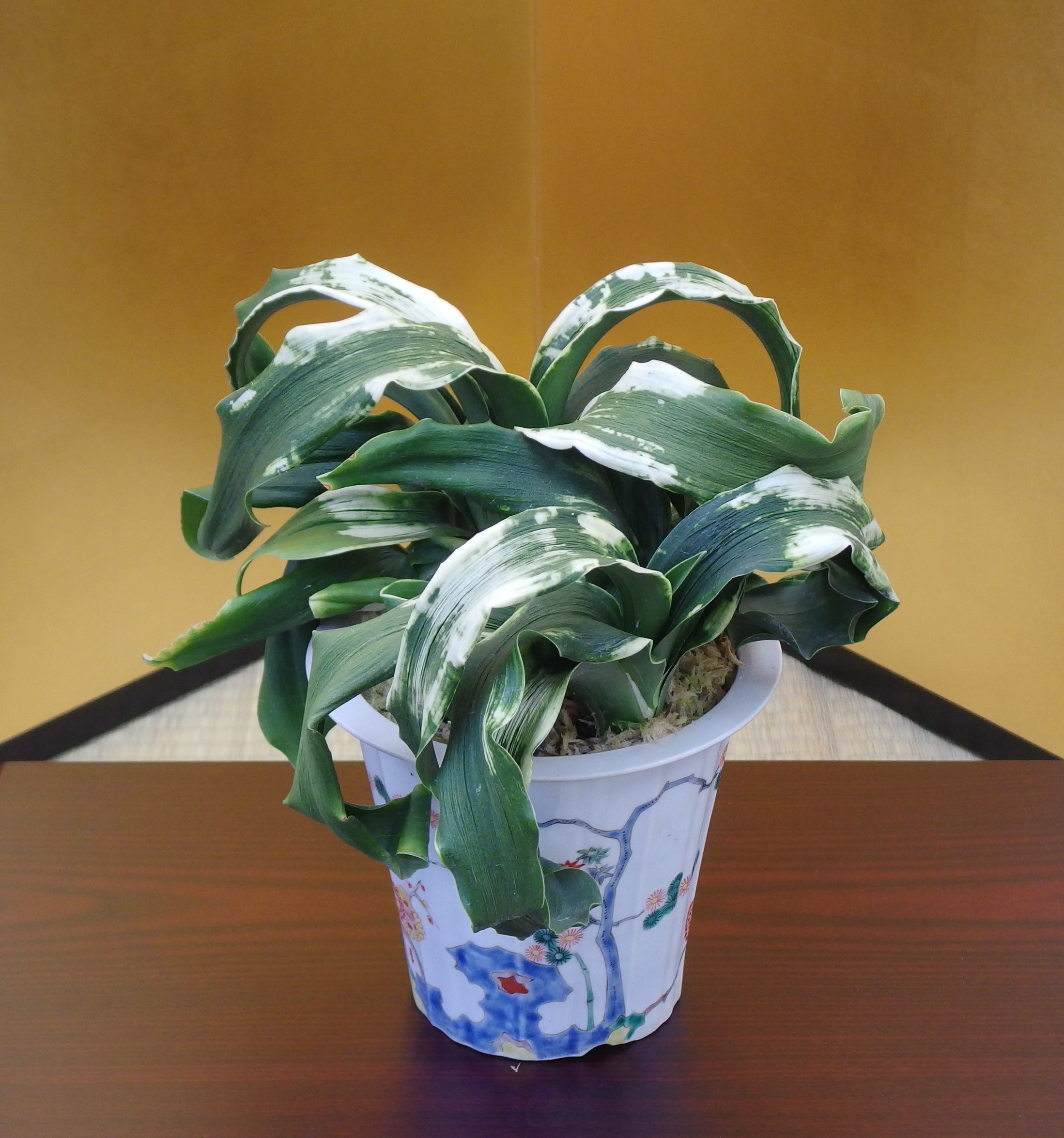 春雪(しゅんせつ)6年生 濃緑色の葉に白い矢筈柄を見せ低い雅糸竜竜を現します。大柄に入る矢筈柄葉の裏から見ると矢羽の模様が良く分かります。性質は強健で作りやすい品種。新芽の伸びる時期に日光を充分に採ると柄が出やすい。