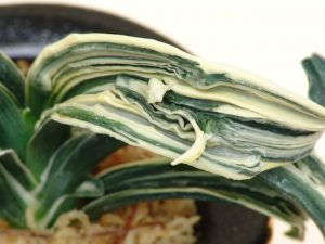 跳ね竜で一番有名なのは玉姫でしょうか。なかなかここまで綺麗な跳ね竜を魅せる品種は少ないです。若い頃は雅糸龍だったものが、年を重ねるにつれ、雅糸龍も深い山を刻むようになり、玉竜、跳ね竜を現すようになります。竜が跳ねているようにみえるので跳ね竜といいますが、角のように見えるという人も。角竜(つのりゅう)とも呼ばれ、これは万年青の芸の奥深さなのですが、地域ごとに呼び名がかわったりしています。