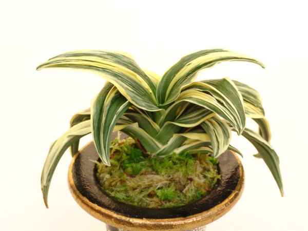 品名 駒来錦(こまきにしき) 6年生 鉢4.0号 葉長7㎝、葉幅3㎝内外の中型種。首元太く、腰の低い容姿に、肉厚の葉が重なり、力量感がある。盛り上がるような荒い雅糸竜が葉面を覆い、跳ね竜、玉竜、熨斗葉、鈴虫剣など多彩な葉芸が現れ、黄白色の深い覆輪に彩られ、豪快でインパクトがある。若木の頃に見せる独特の鎌葉は、本種の特徴で愛嬌がある。性質は強く、繁殖も良い。採光は中程度が良く、強すぎると型くずれしやすい。施肥は強めのほうが葉持ちが良くなる。