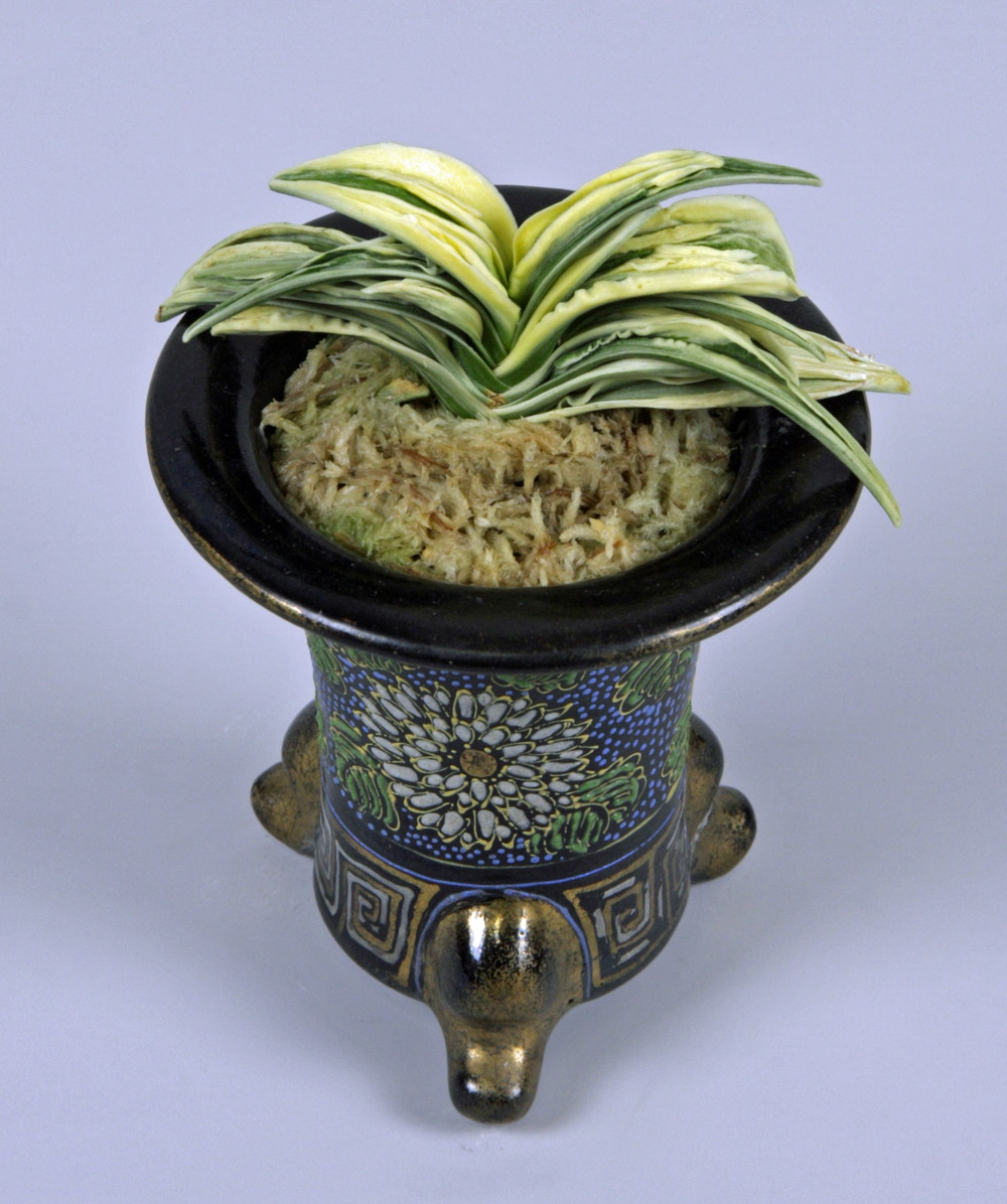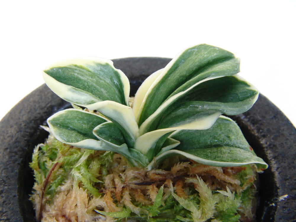 中型種。『日比野実生』とよばれていた頃から品質には定評がある。肉厚の葉には高く粗い雅糸竜と細かい雅糸竜を見せる。葉の縁を彩る覆輪にビリが大きく波打ち、本種であることを一目で理解させる。淡い地合いはやや粗く、柚子肌で艶消しである。力強さと淡い色合いが、不思議なほどに調和のとれた絶品でもある。性質は普通。採光・施肥はやや弱め。全体が淡い黄色みのある葉のため葉焼けを起こしやすいので要注意。子上げ芋吹きも良好だが、芯がたまに止まることがある。