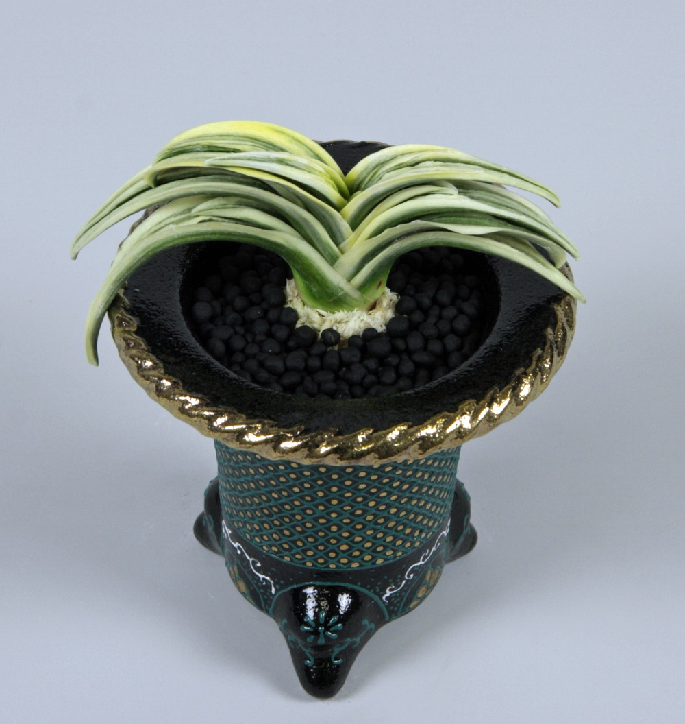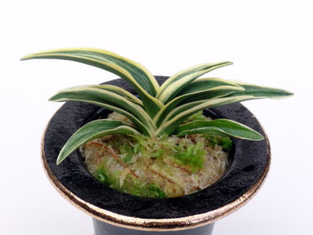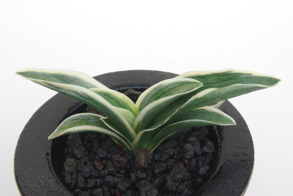 聖富貴(せいふうき) 2年生 鉢 3.3号 濃緑色の葉に深い覆輪を見せる。