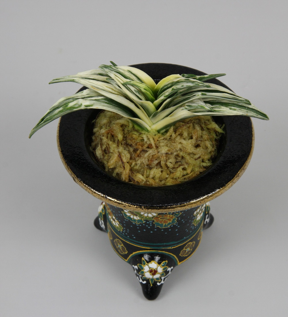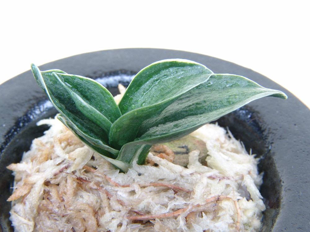 葉長5㎝、葉幅2㎝内外の小型種。首元が太く、腰の低い安定感のある端正な容姿は、独特の風格を感じさせる。肉厚の葉に、粗い熨斗、雅糸竜がかかり、跳ね竜、玉竜、鈴虫剣など多彩な葉芸が魅力的で、濃緑色の深い地合いと調和して、個性を主張する。性質は強健で繁殖良い。採光は強めで良く、施肥は中程度で良い。